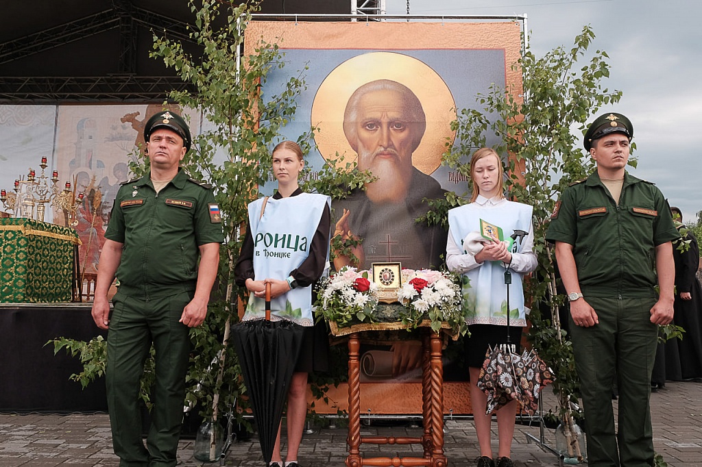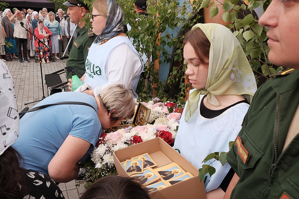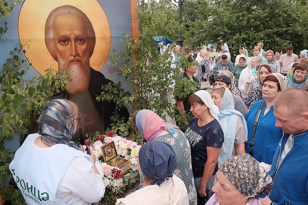 Напомним, 22 июня в Троицк из Свято-Троицкой Сергиевой Лавры был доставлен ковчег с частицей мощей преподобного Сергия Радонежского. Святыня во время богослужения также находилась на площади перед храмом святого великомученика Димитрия Солунского, участники богослужения и жители Троицка с благоговением прикладывались к святым мощам.