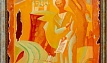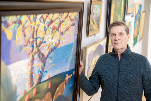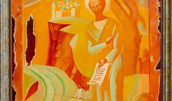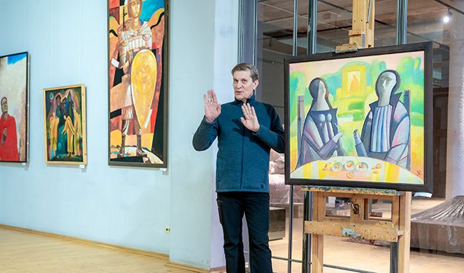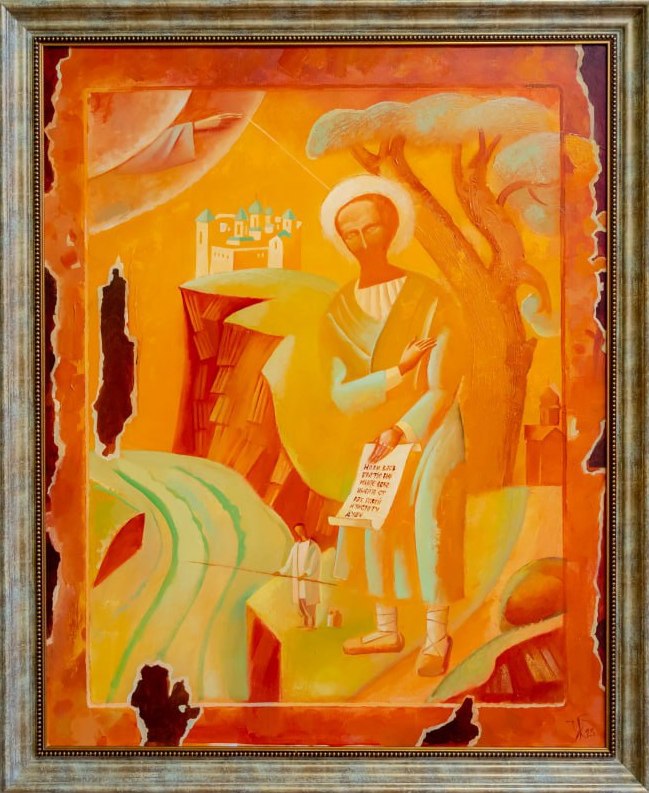 «На картине реставрация ассоциируется с возвращением России к православию. Что касается желто-оранжево-красных тонов, то это цвета радости. На канонических иконах святой праведный Симеон изображен в синем облачении. Мне же хотелось подобрать цвета, которые излучали бы теплоту. Первый вариант картины я написал в начале нулевых, второй, представленный на выставке, – в 2025 году», – рассказал художник.