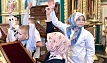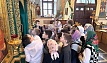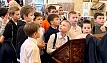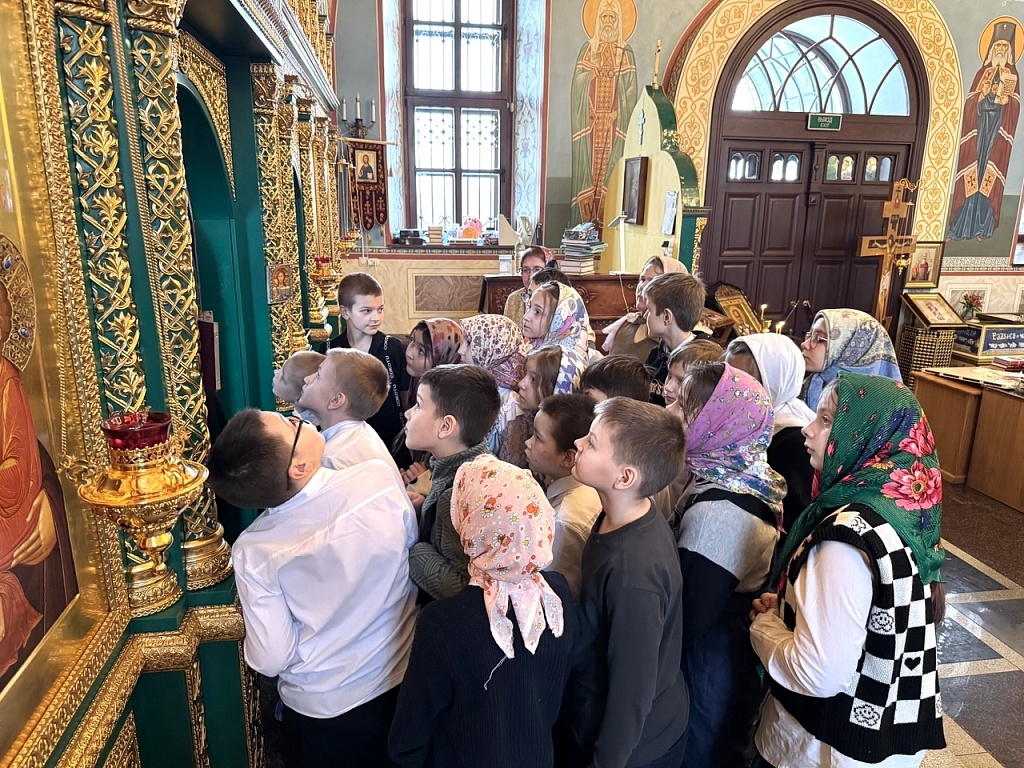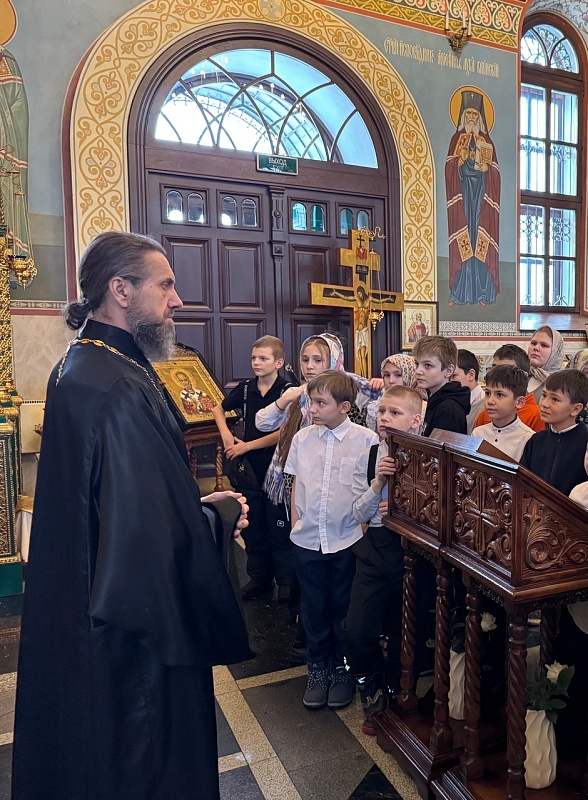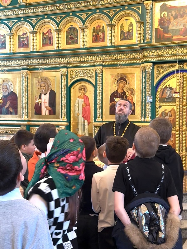 Отец Алексий рассказал школьникам об истории храма, его устройстве. Подробно поговорили про роспись: дети узнали о сюжетах Рождества Христова, Пасхи и других евангельских событиях, изображенных на стенах, а также познакомились с иконами и иконостасом.