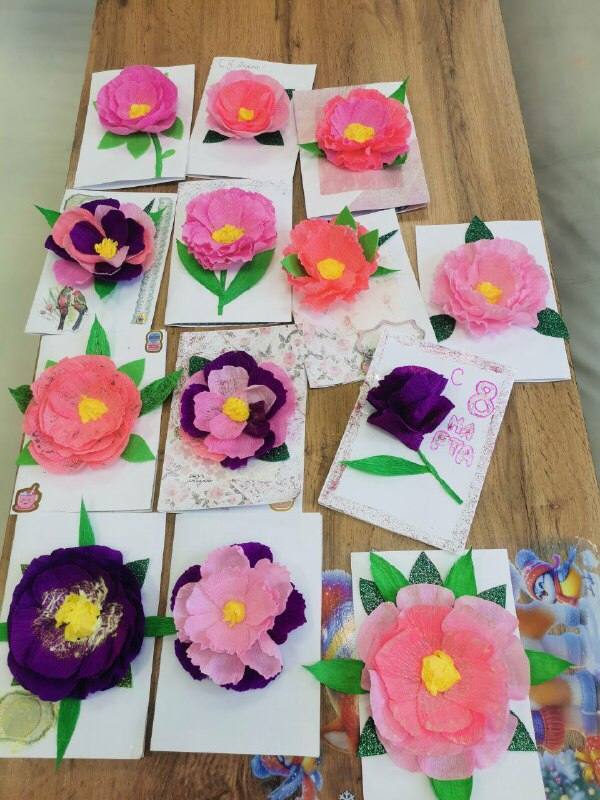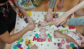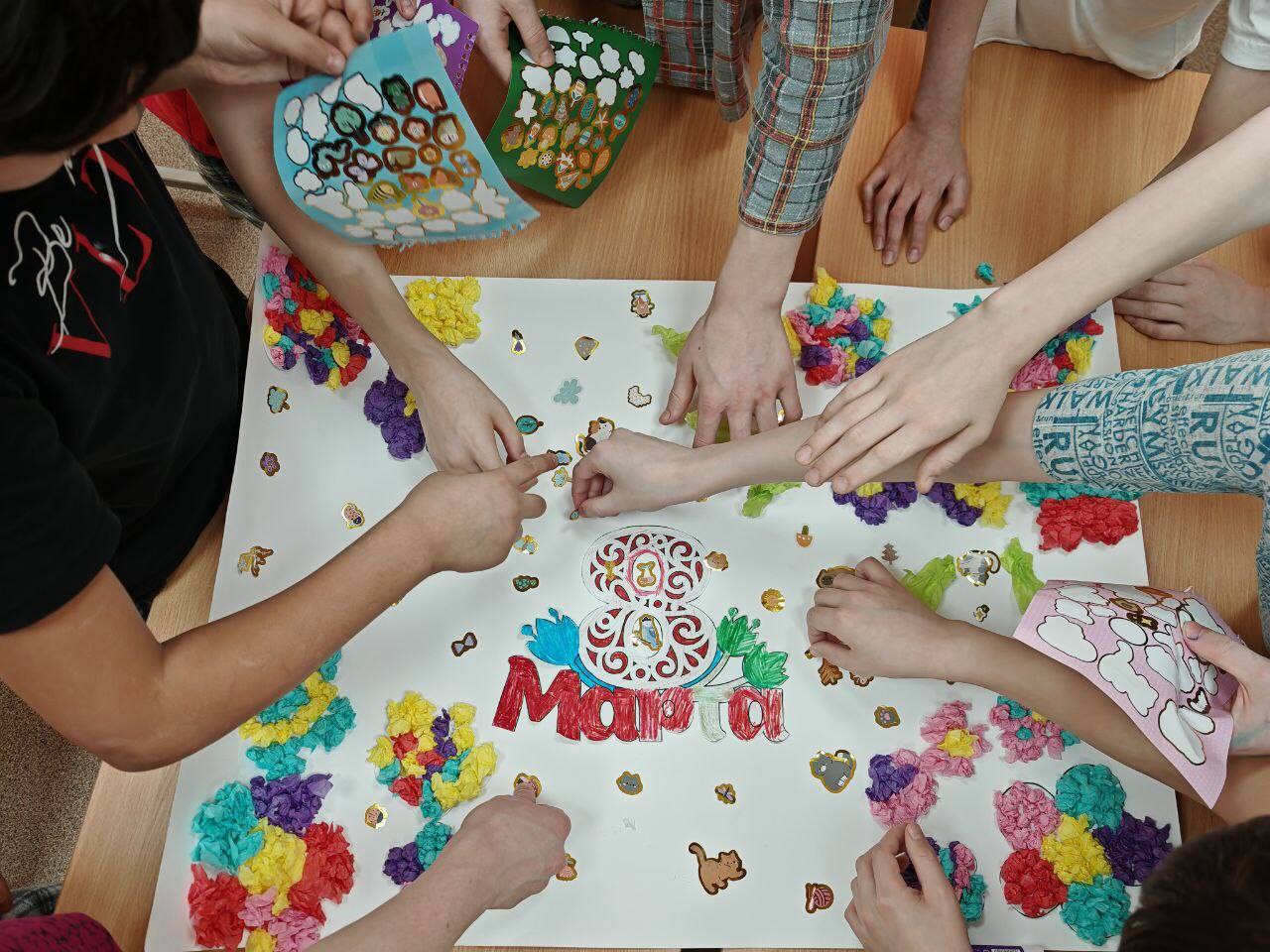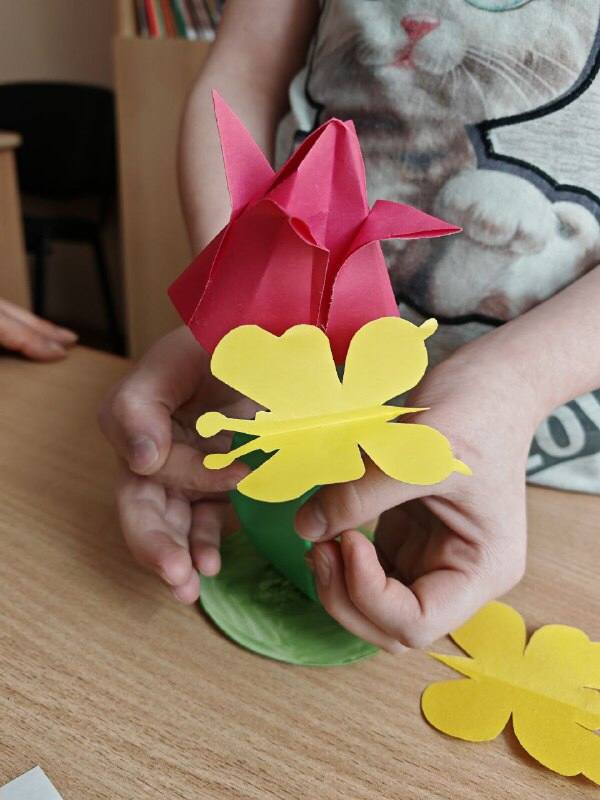 Мальчики с увлечением расписывали деревянные заготовки-магниты. Вместе они создали большой праздничный плакат, который теперь украшает стену отделения. Девочки в техниках оригами и свит-дизайна мастерили нежные тюльпаны, украшая их бабочками.