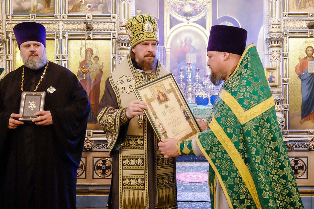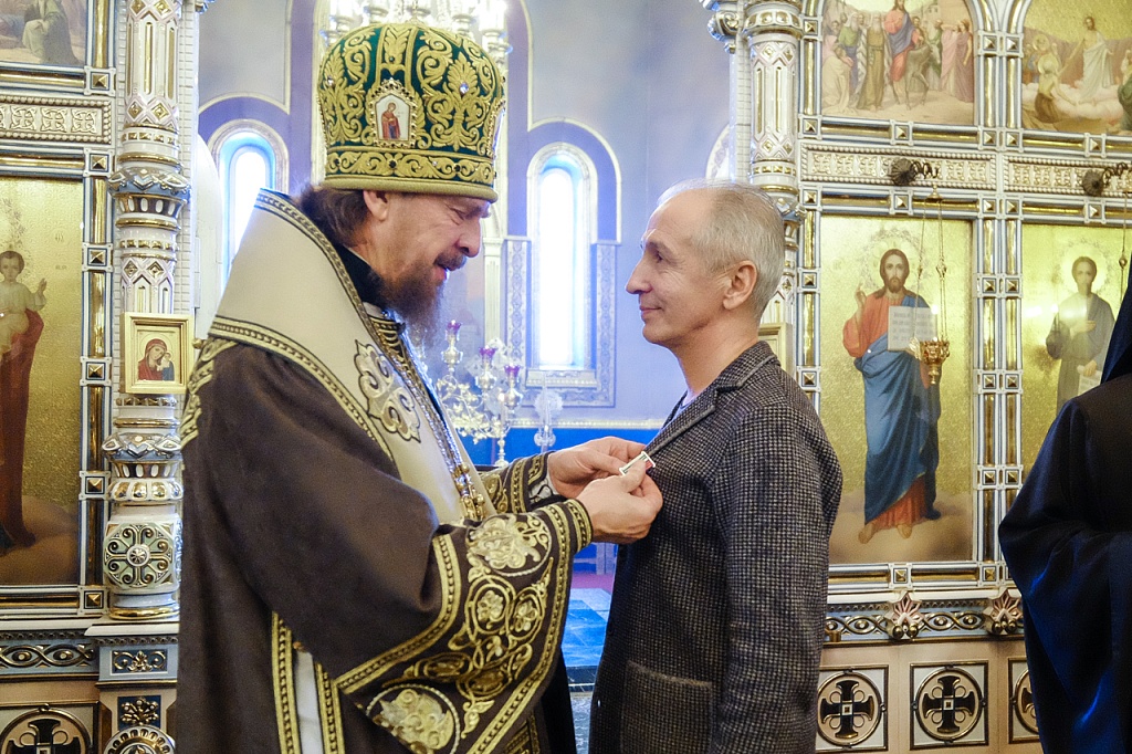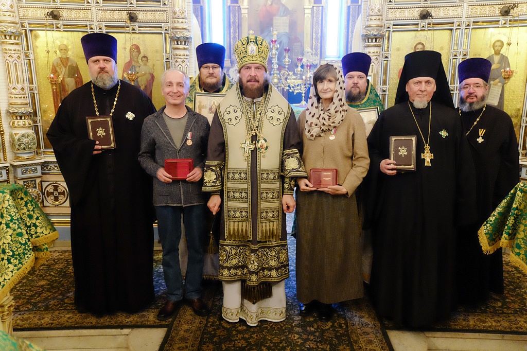 Во время праздничного богослужения целому ряду священнослужителей и благочестивых мирян, усердно потрудившихся на благо Церкви, были вручены высокие церковные награды.