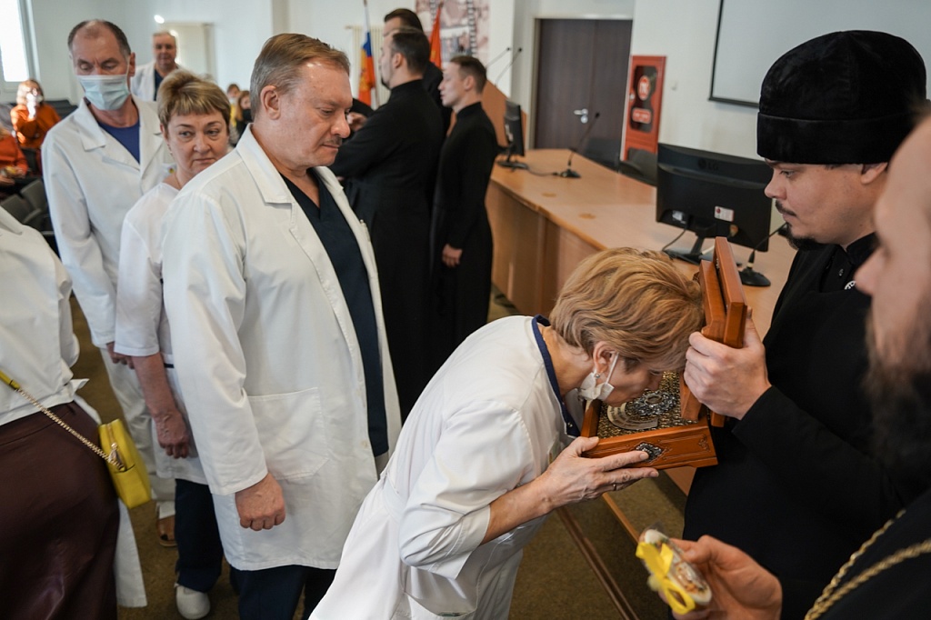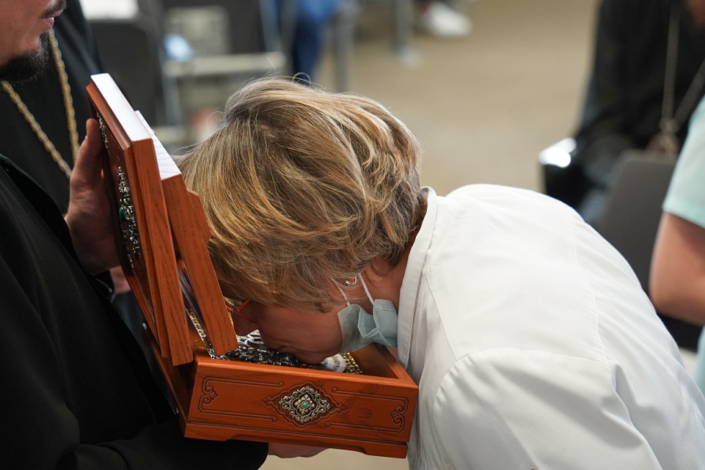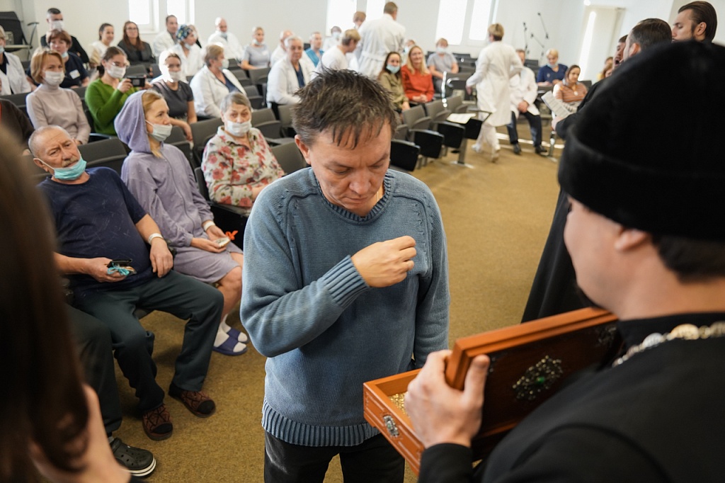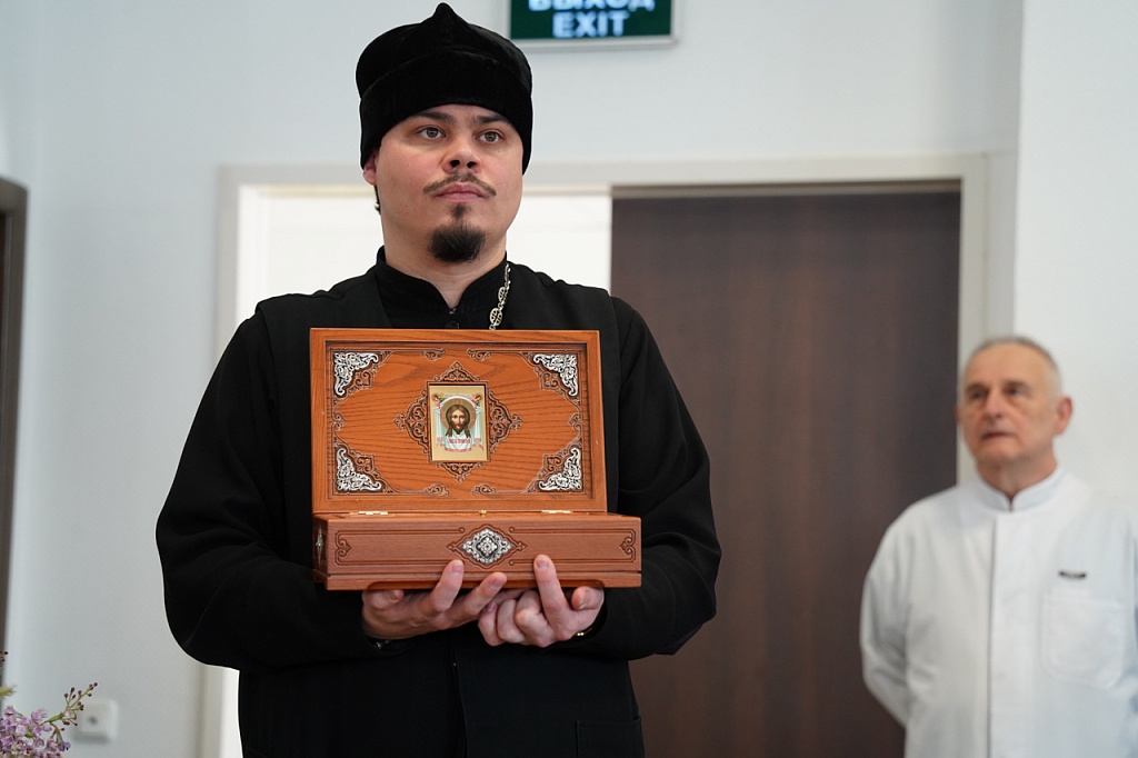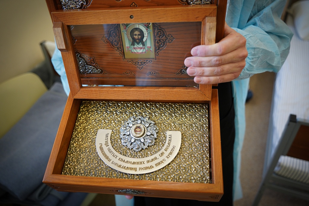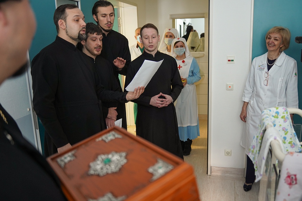 Федеральный кардиоцентр находится вблизи кафедрального собора Рождества Христова. Из собора в лечебное учреждение привезли ковчег с частицей Яслей Господа нашего Иисуса Христа.