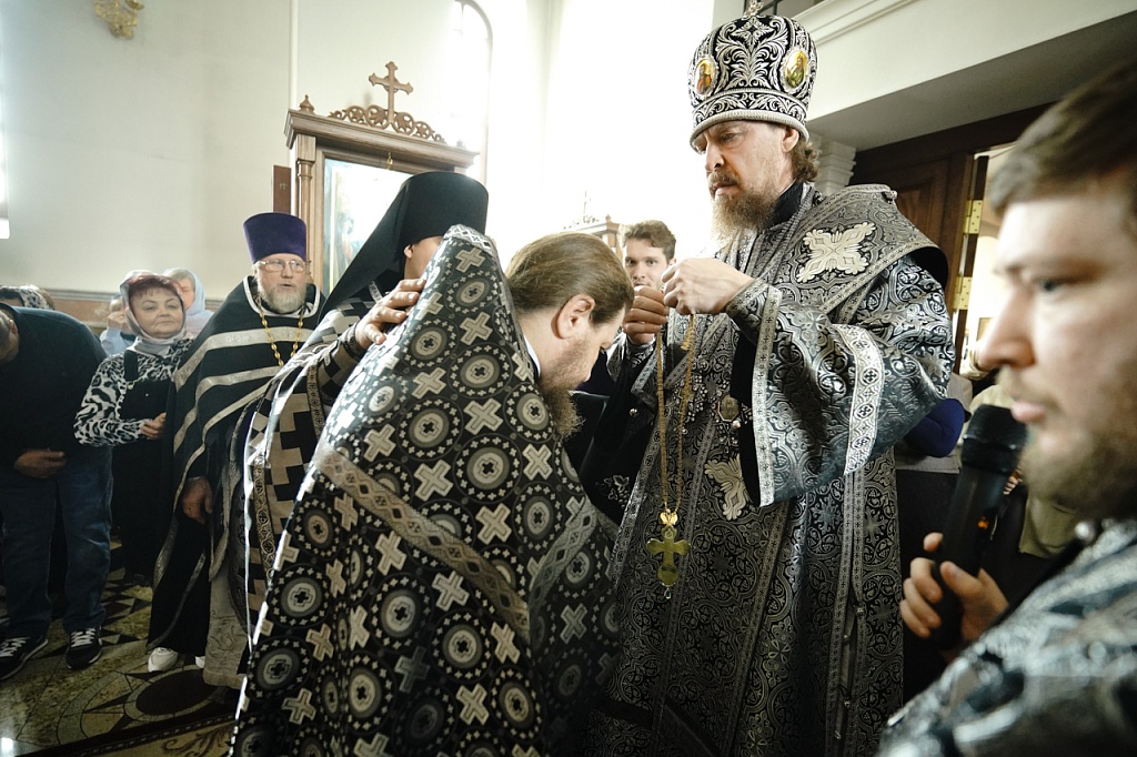 За богослужением митрополит Алексий вручил церковные награды. Иерей Николай Невзоров награжден правом ношения наперсного креста с украшениями, настоятель копейского храма преподобного Сергия Радонежского иерей Виктор Финагин – правом ношения палицы, клирик Покровского храма Копейска иерей Павел Садаков – правом ношения камилавки.