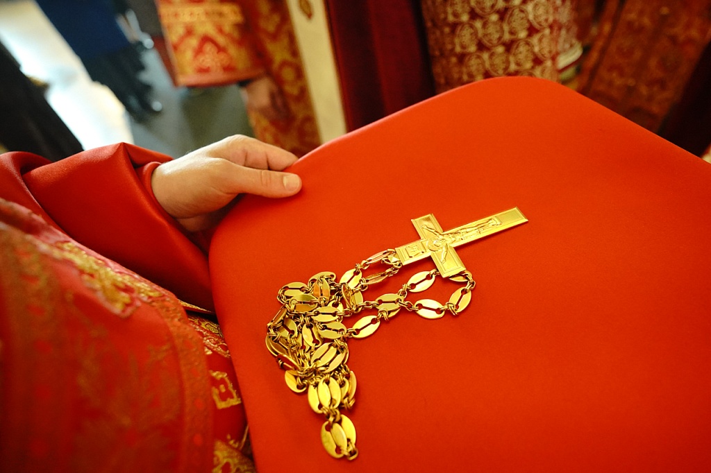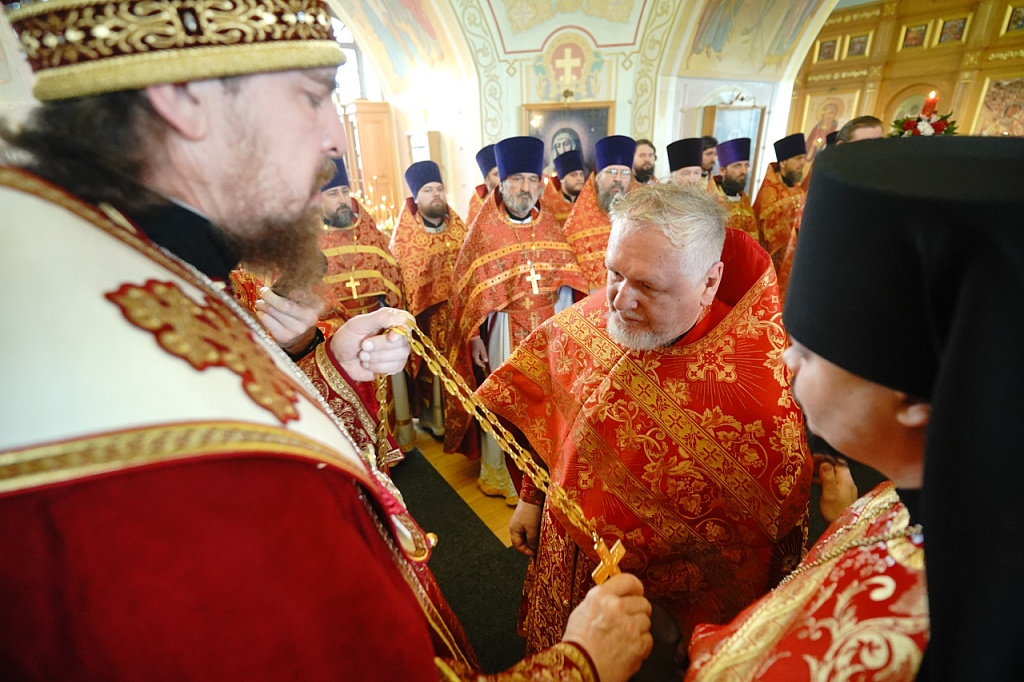 За богослужением митрополит Алексий наградил клирика снежинского храма иконы Божией Матери «Державная» иерея Владимира Лобанова правом ношения наперсного креста золотого цвета.