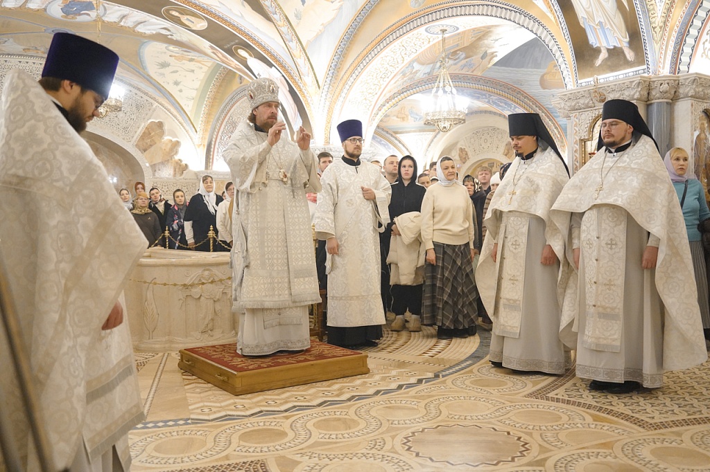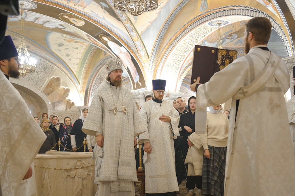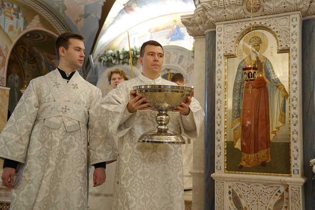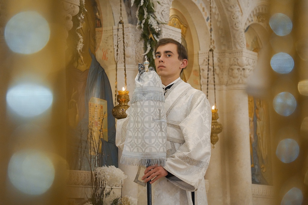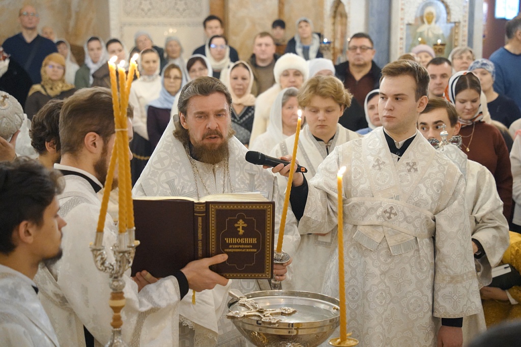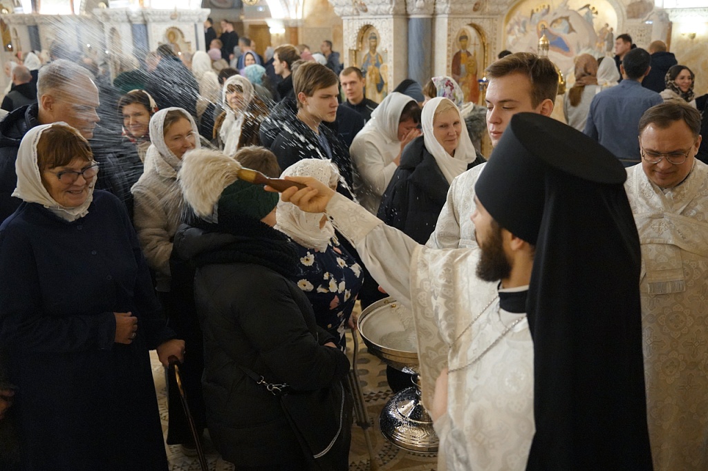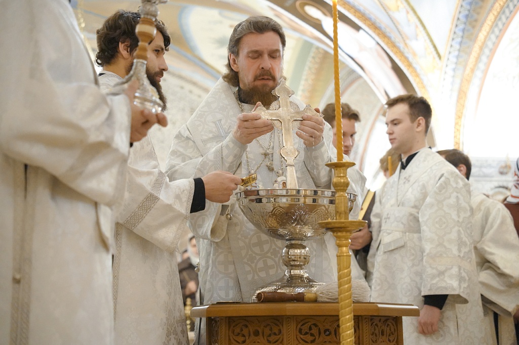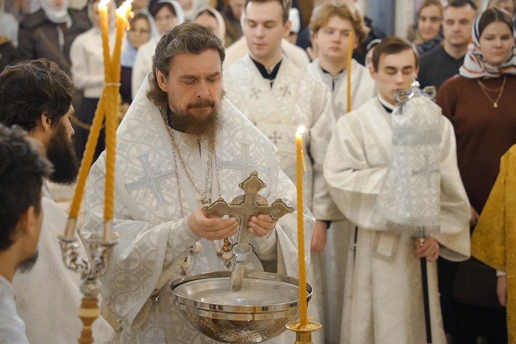 На службе был прочитан отрывок из Евангелия от Матфея (Мф.3:13-17), в котором говорится о том, как Иисус Христос пришел на Иордан к Иоанну – креститься от него. Пророк видит в Иисусе Бога и говорит: «Мне надобно креститься от Тебя». Но Господь отвечает, что «так надлежит нам исполнить всякую правду». После крещения Иисуса Иоанн увидел открывшееся небо, Духа Божия, который в виде голубя спускается с небес на Спасителя. С неба звучит голос Бога Отца: «Сей есть Сын Мой возлюбленный, в Котором Мое благоволение».