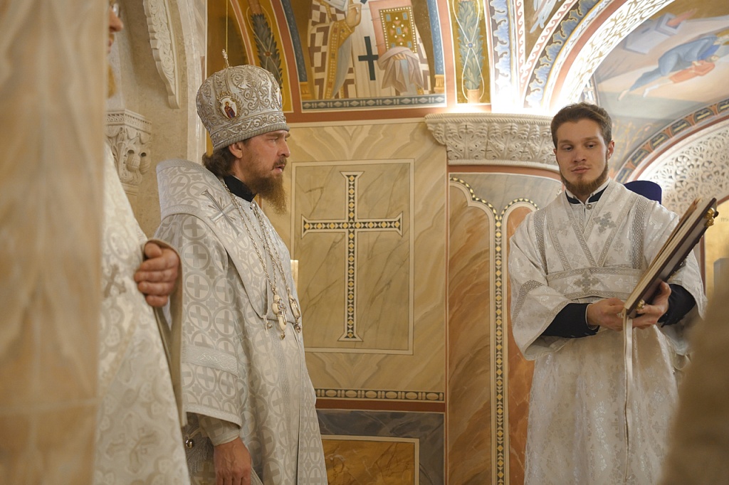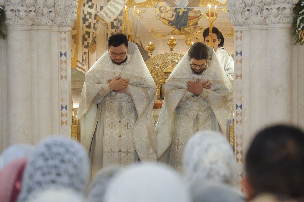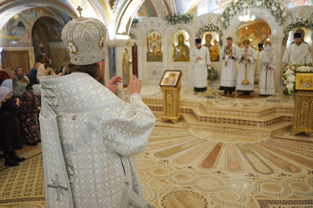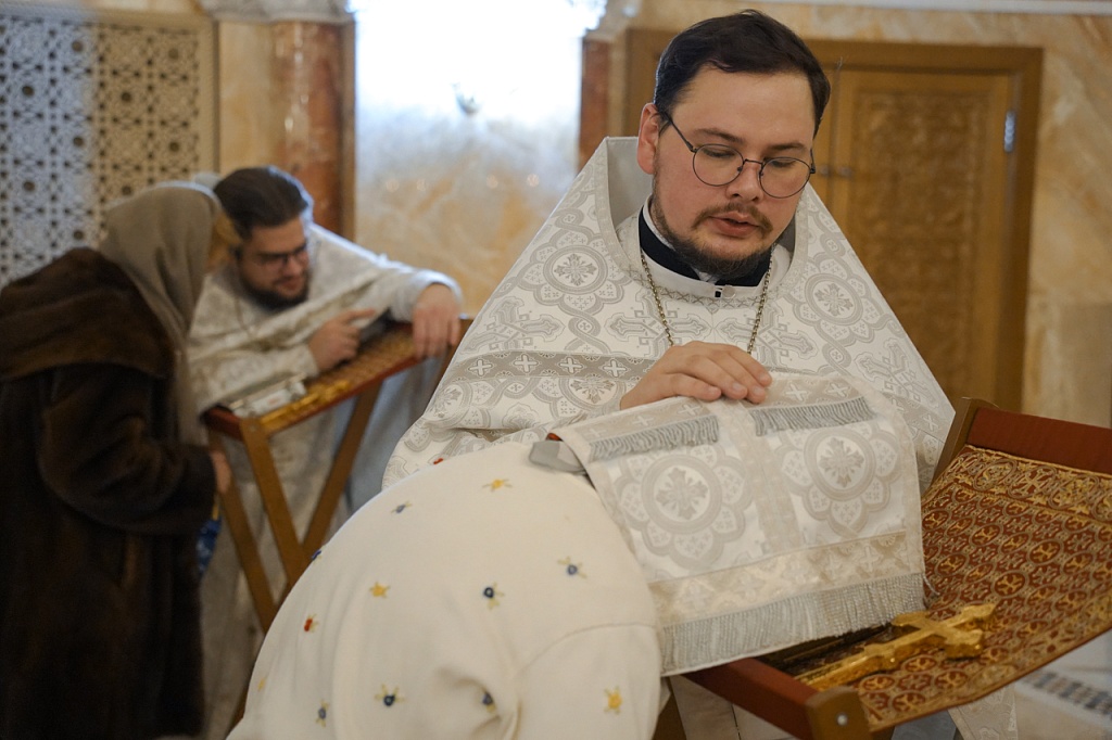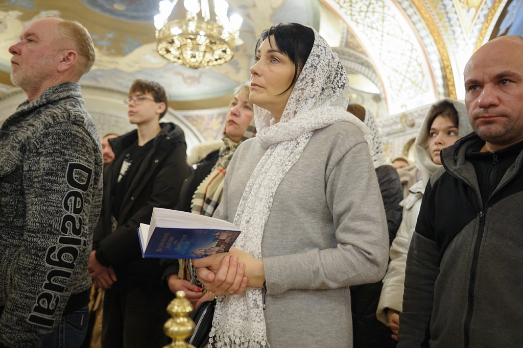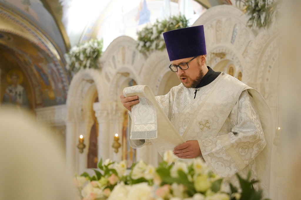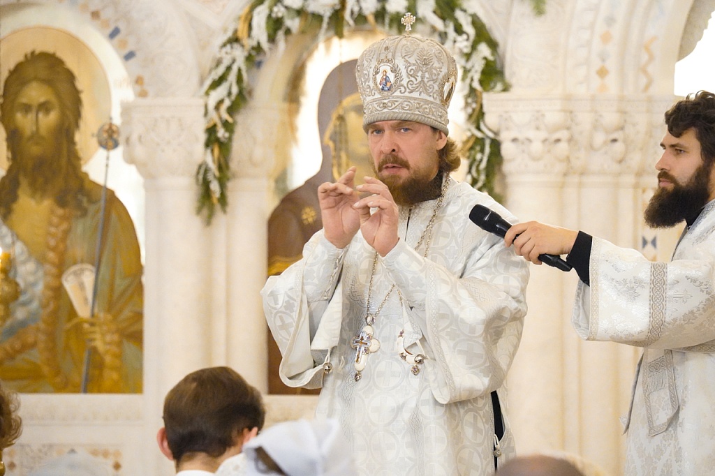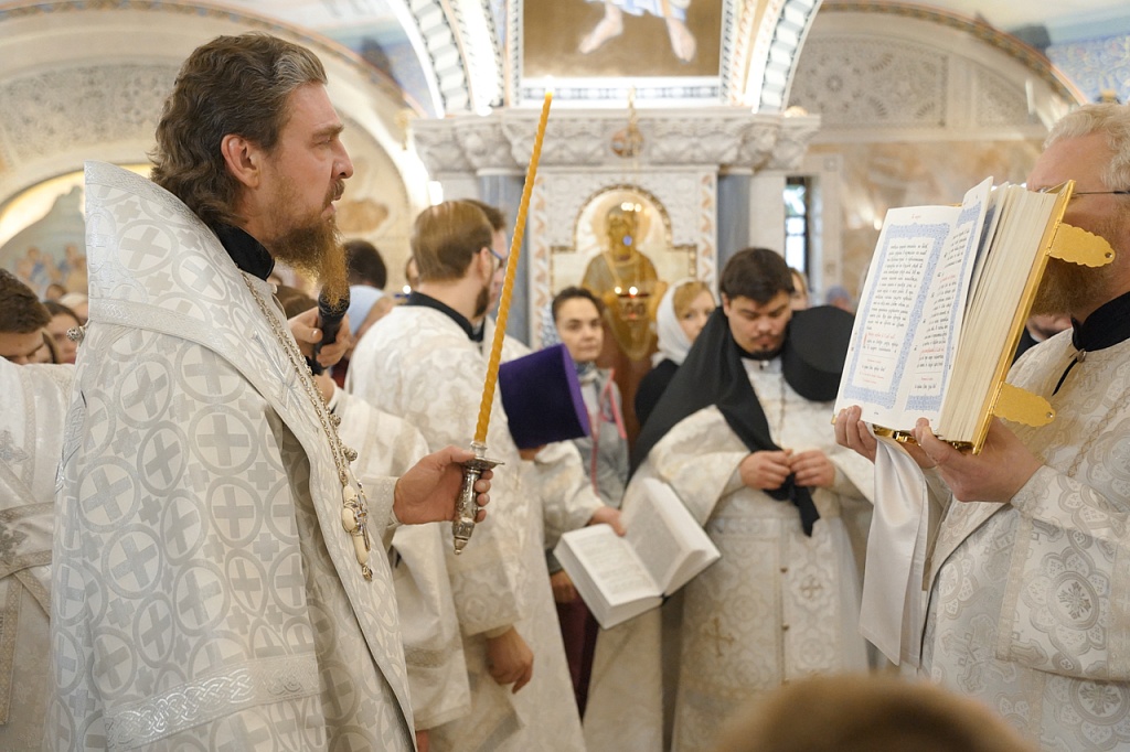 На службе был прочитан отрывок из Евангелия от Матфея (Мф.3:13-17), в котором говорится о том, как Иисус Христос пришел на Иордан к Иоанну – креститься от него. Пророк видит в Иисусе Бога и говорит: «Мне надобно креститься от Тебя». Но Господь отвечает, что «так надлежит нам исполнить всякую правду». После крещения Иисуса Иоанн увидел открывшееся небо, Духа Божия, который в виде голубя спускается с небес на Спасителя. С неба звучит голос Бога Отца: «Сей есть Сын Мой возлюбленный, в Котором Мое благоволение».