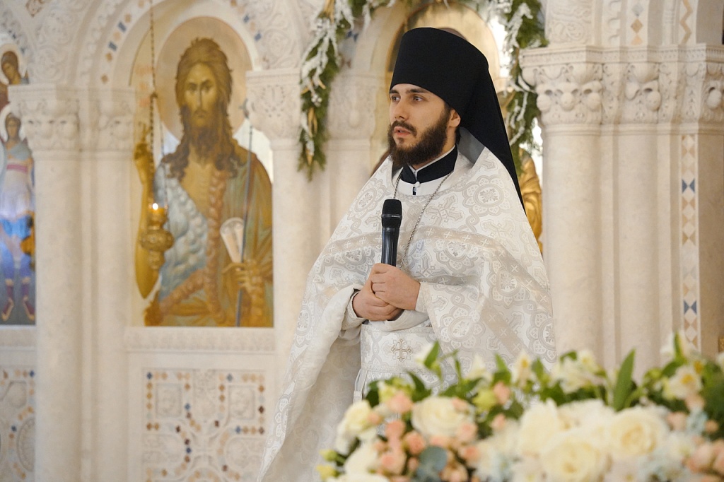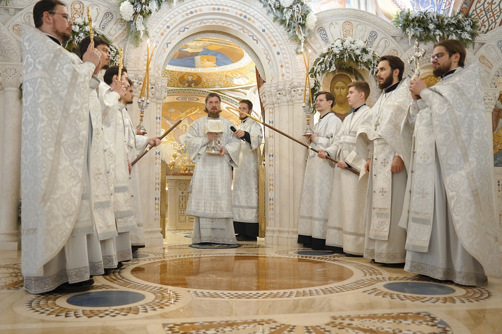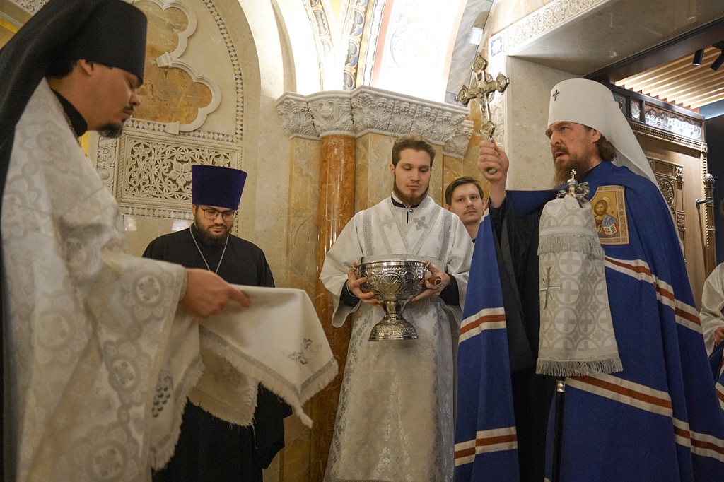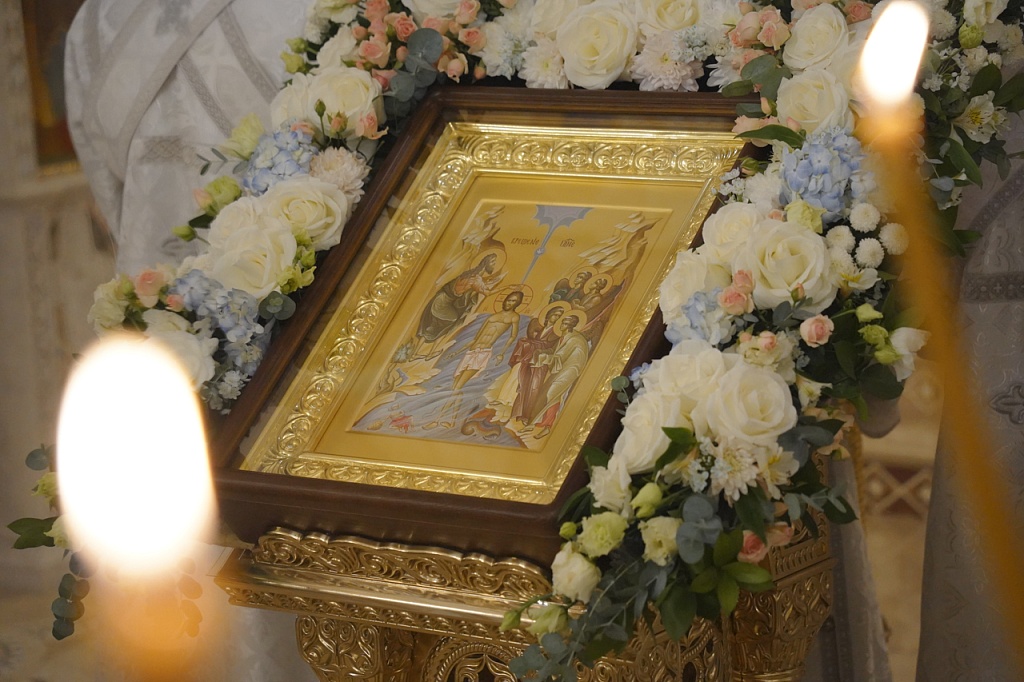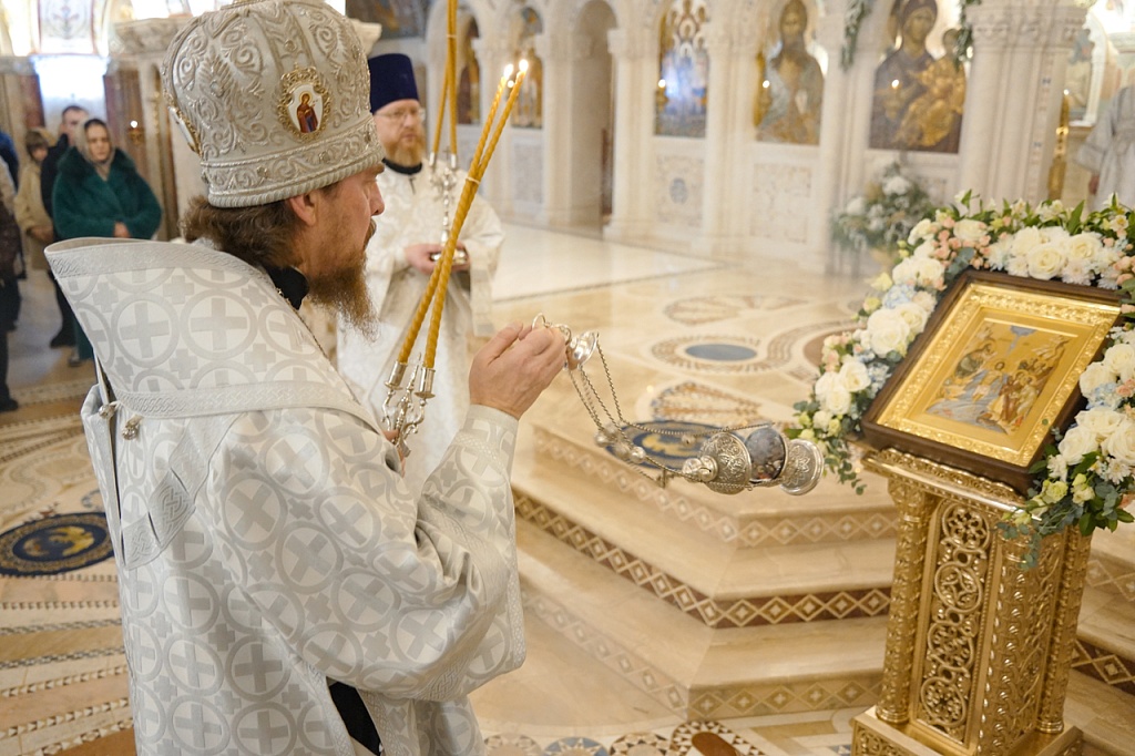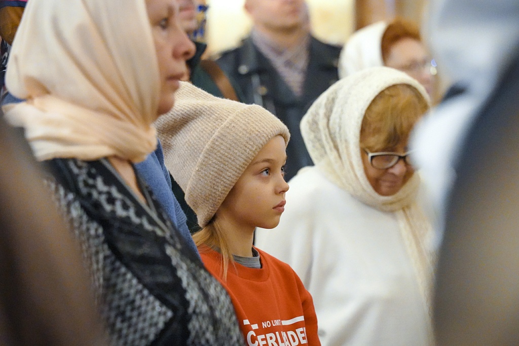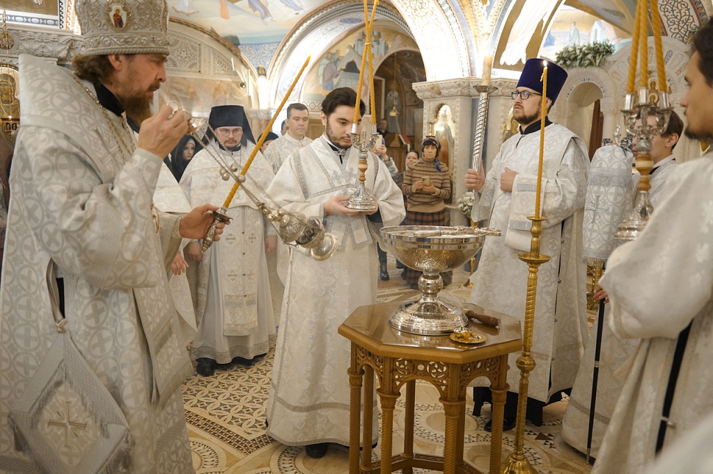 На службе был прочитан отрывок из Евангелия от Матфея (Мф.3:13-17), в котором говорится о том, как Иисус Христос пришел на Иордан к Иоанну – креститься от него. Пророк видит в Иисусе Бога и говорит: «Мне надобно креститься от Тебя». Но Господь отвечает, что «так надлежит нам исполнить всякую правду». После крещения Иисуса Иоанн увидел открывшееся небо, Духа Божия, который в виде голубя спускается с небес на Спасителя. С неба звучит голос Бога Отца: «Сей есть Сын Мой возлюбленный, в Котором Мое благоволение».