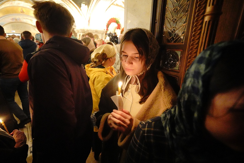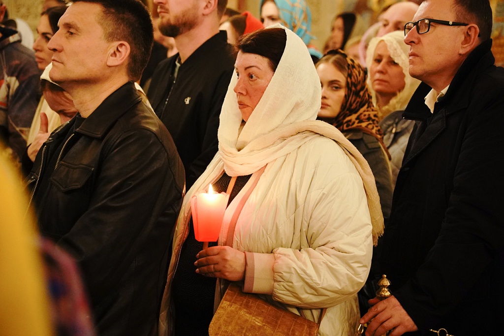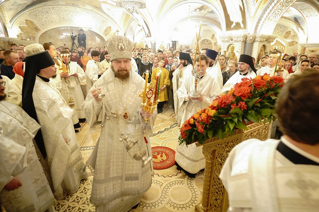 Затем началась Пасхальная утреня. После Пасхального канона митрополит Алексий прочитал «Слово огласительное святого Иоанна Златоуста». Святитель призывает всех насладиться светлым торжеством.
