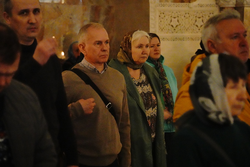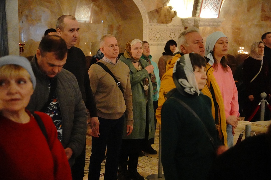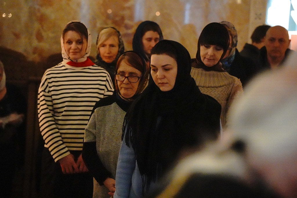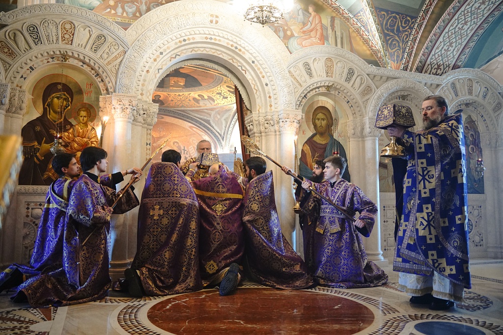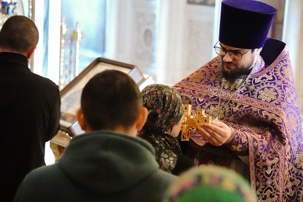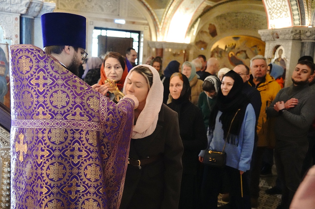 По окончании Литургии Преждеосвященных Даров Крест Христов, который в течение недели находился в центре храма для поклонения, занесли в алтарь.