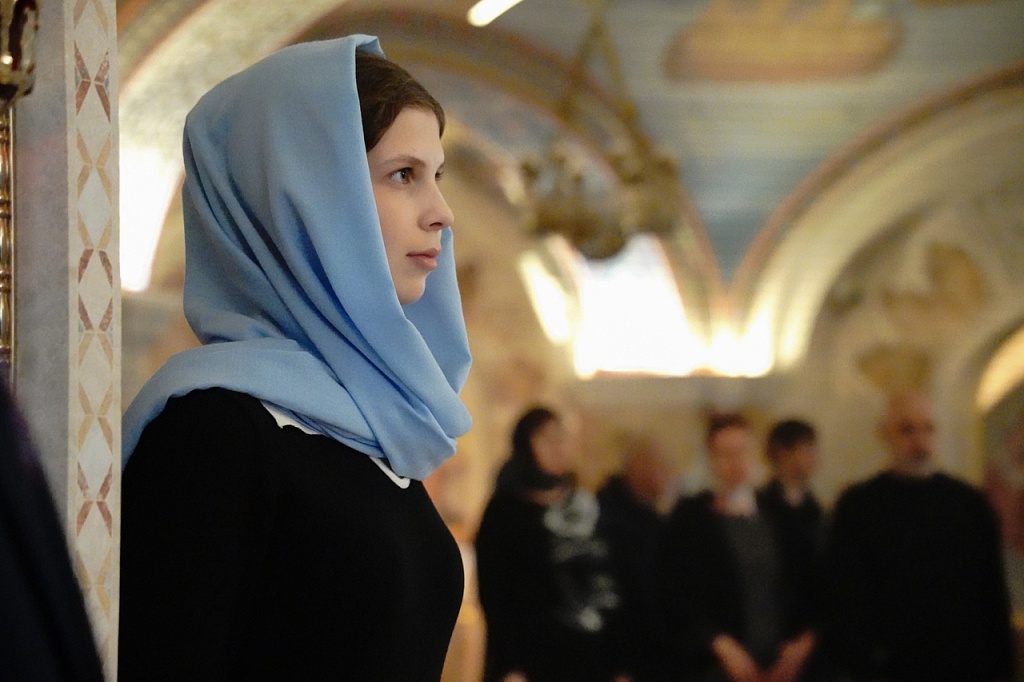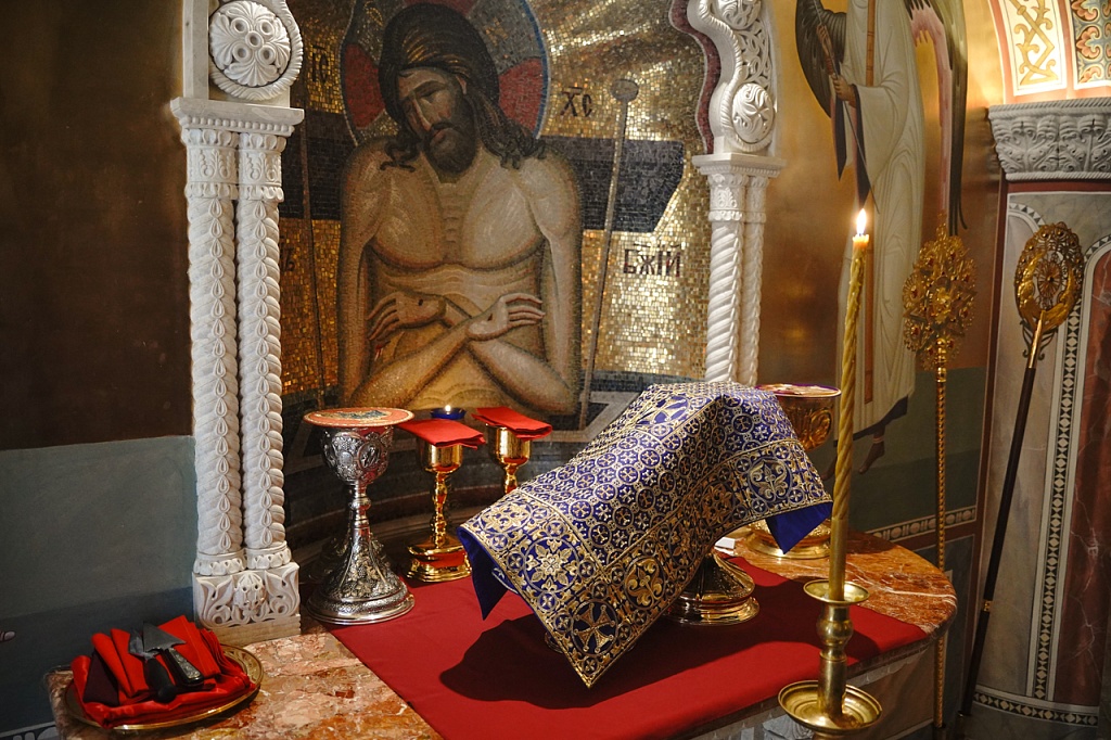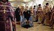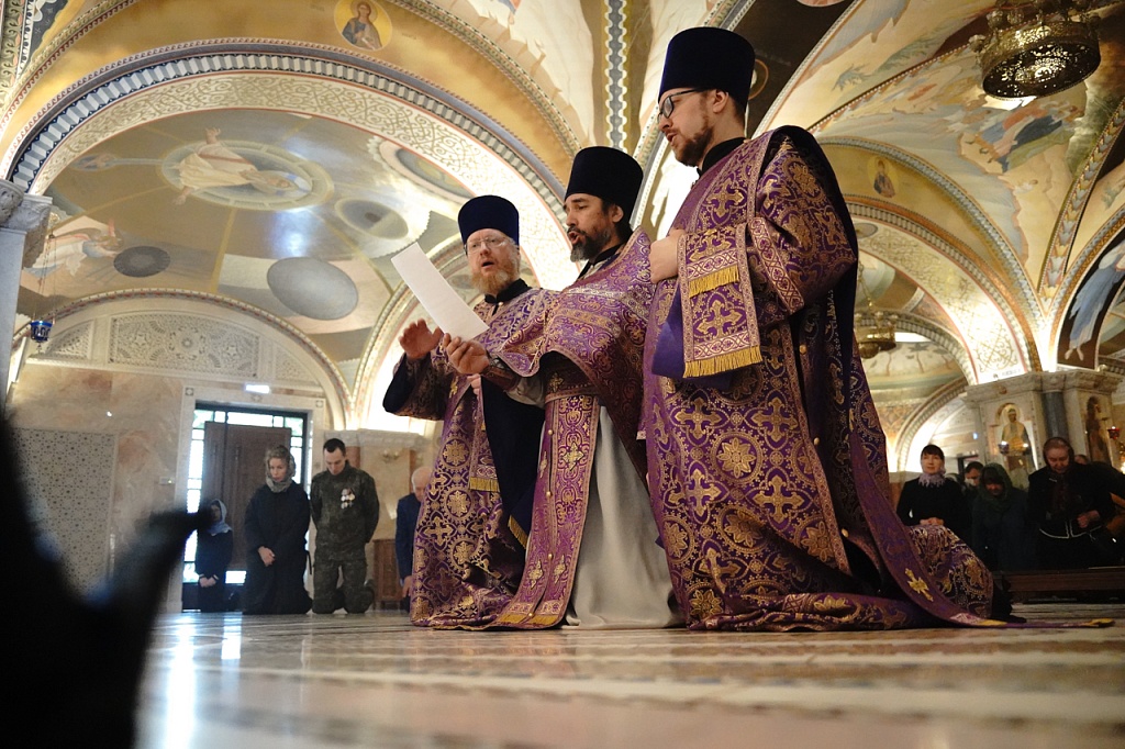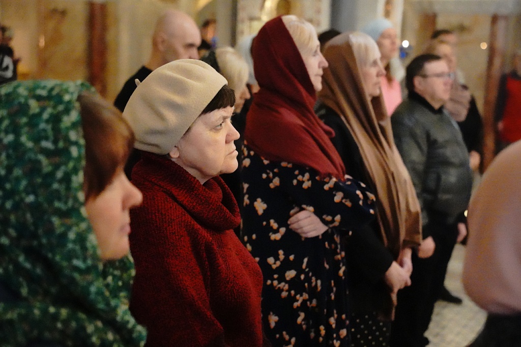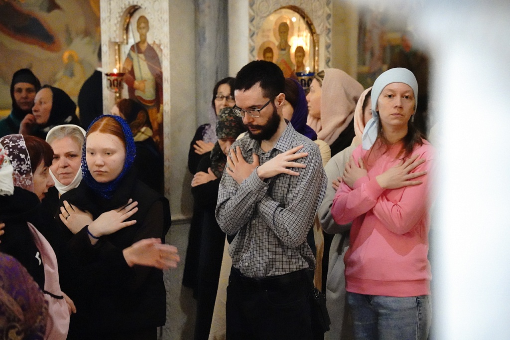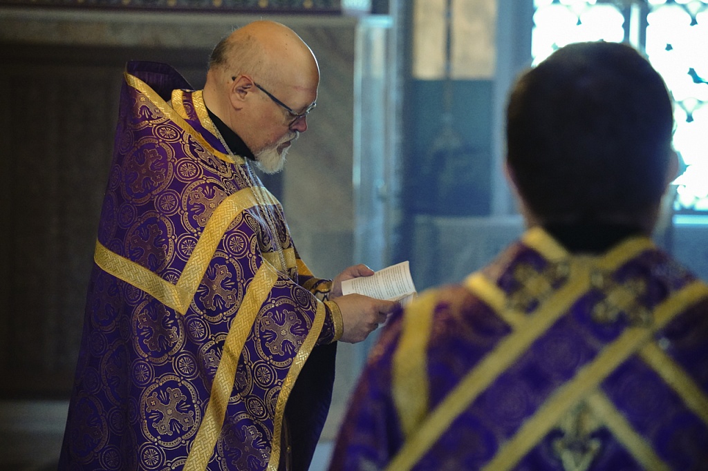 По окончании Литургии Преждеосвященных Даров Крест Христов, который в течение недели находился в центре храма для поклонения, занесли в алтарь.