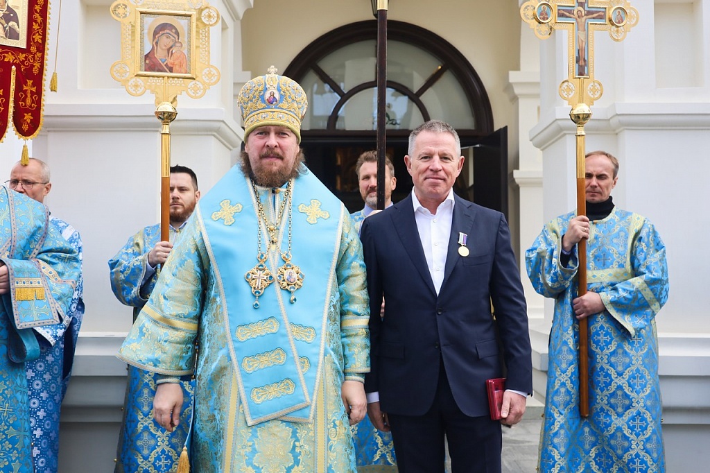 Владыка подчеркнул: исправление жизни лучше начинать с молитвы и участия в Таинствах, с посещения храма Божия. За помощь в строительстве храма в городе Озёрске митрополит Алексий вручил епархиальные медали «За благие труды» двоим меценатам — Андрею Ильичу Комарову и Ольге Михайловне Стебуновой.