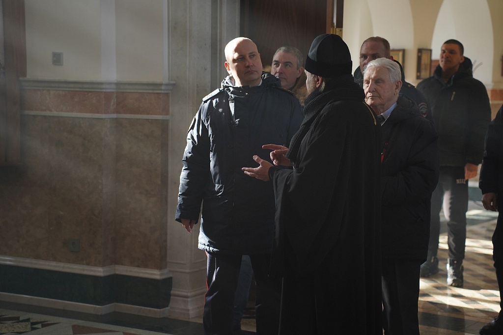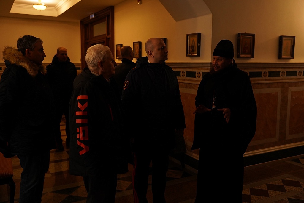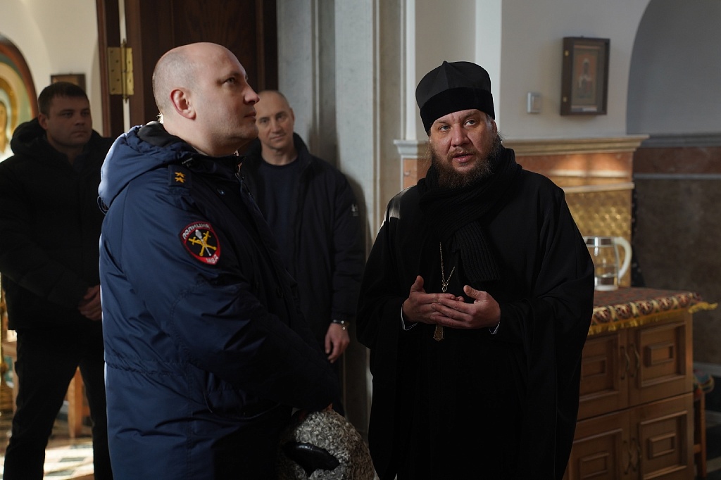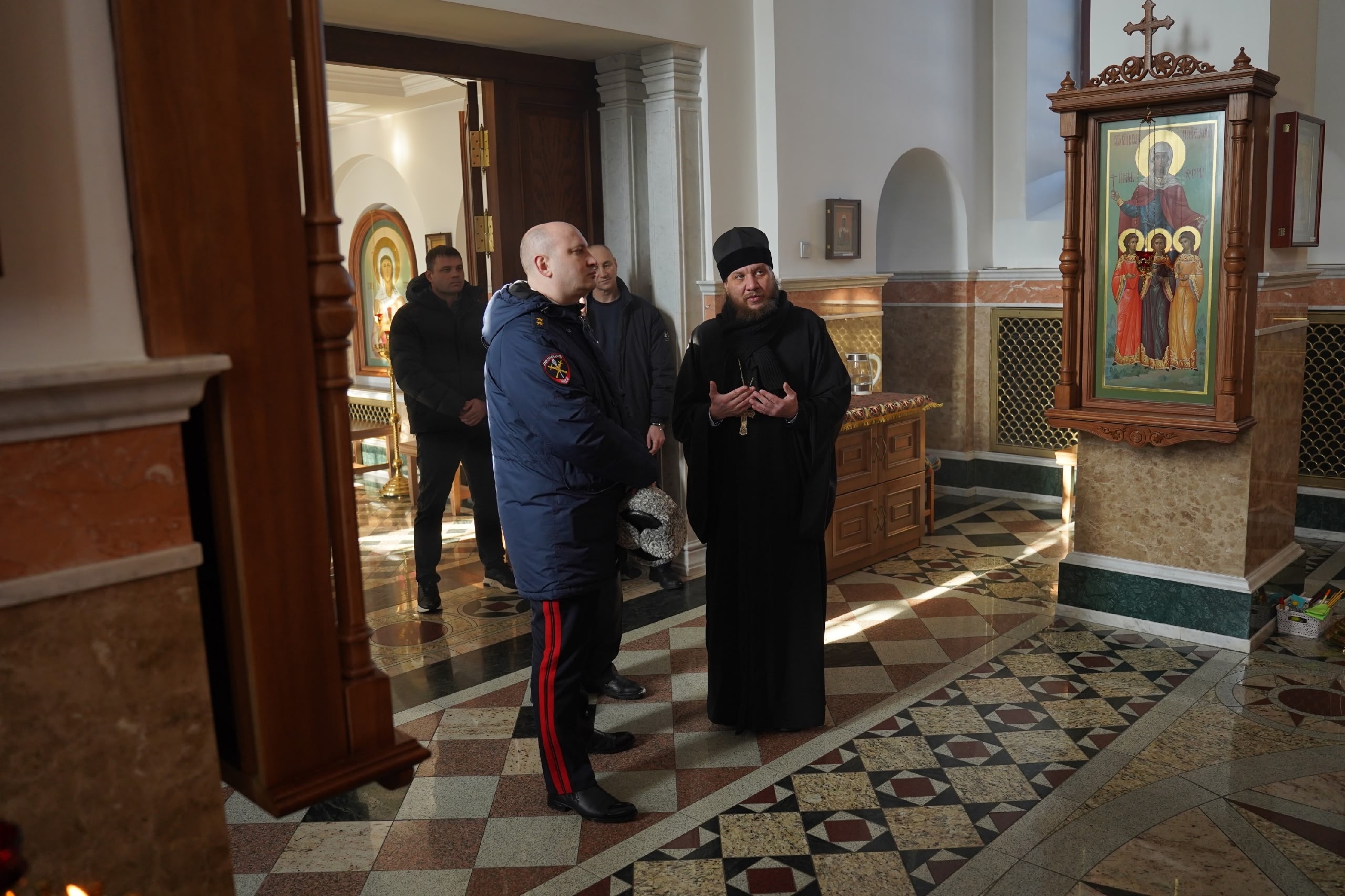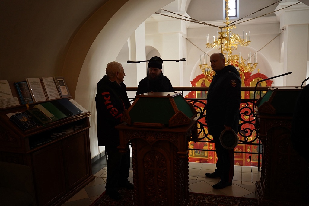 Настоятель храма иерей Николай Невзоров провел экскурсию. Генерал-майор побывал в верхнем храме и нижнем приделе, поднялся на клирос, посетил воскресную школу и спортзал, где занимаются единоборствами дети и молодежь.