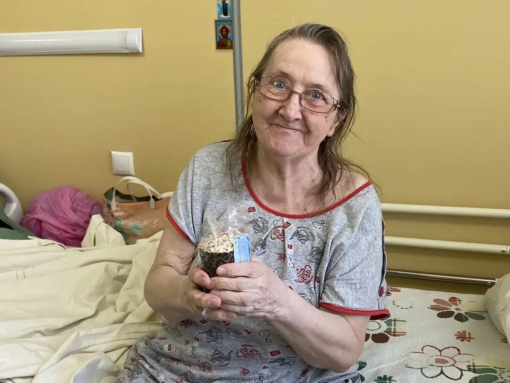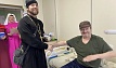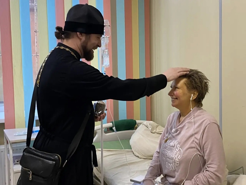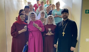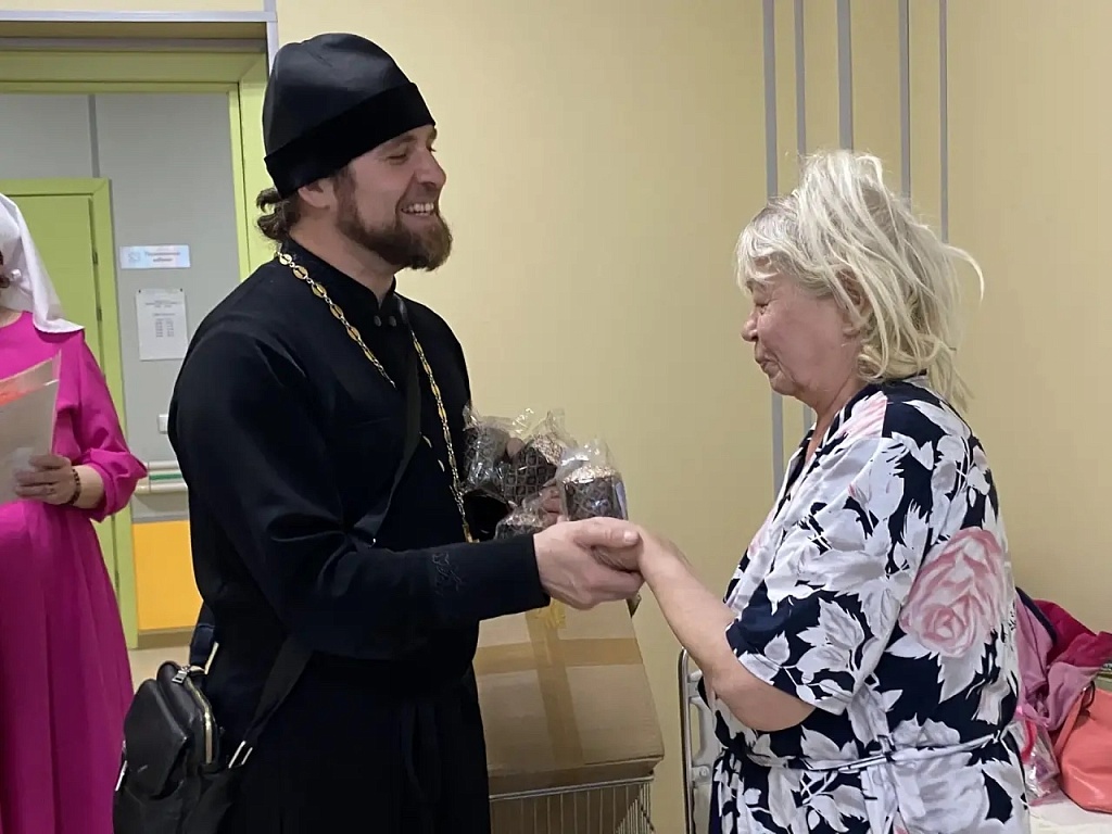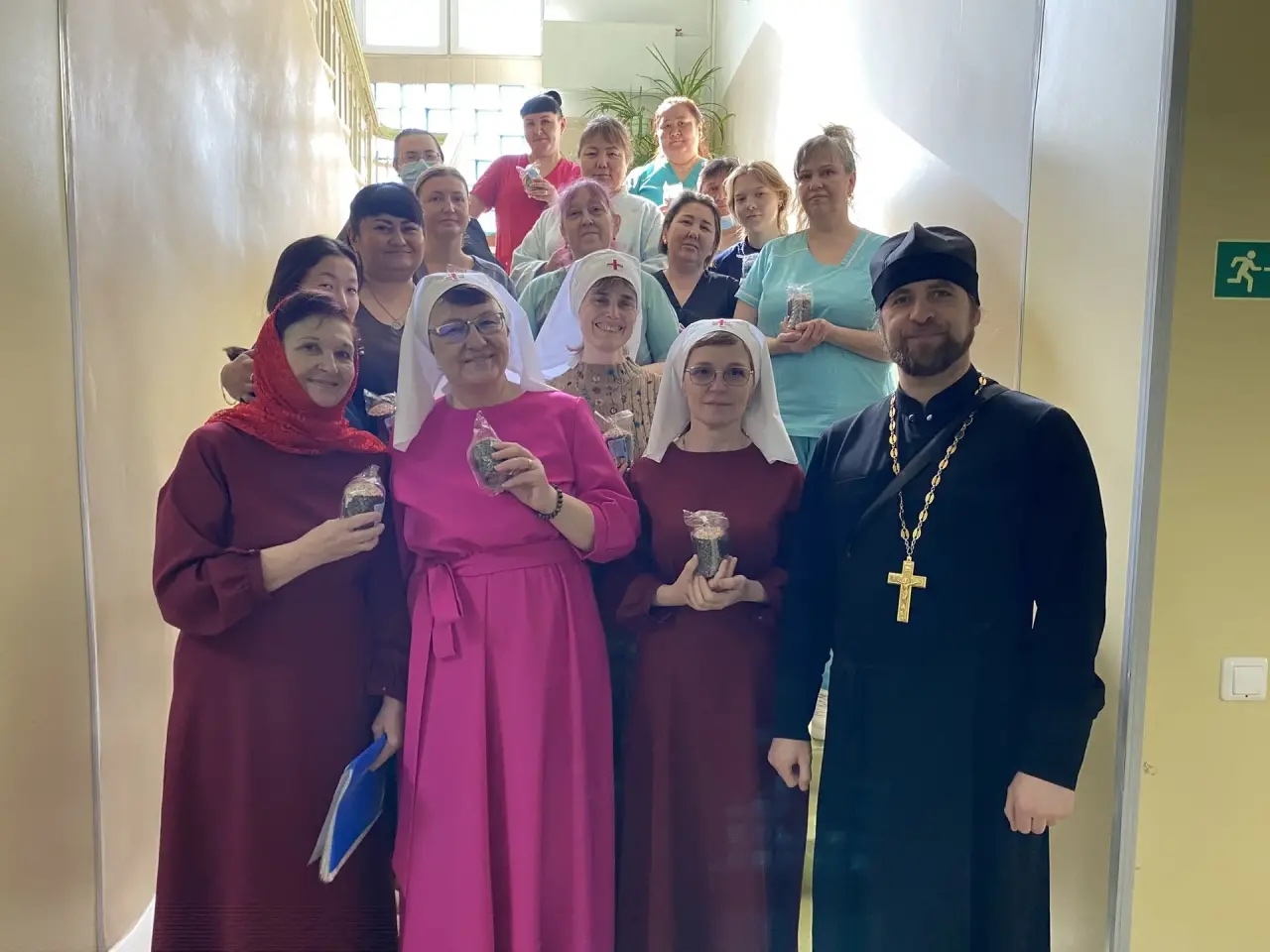 Священник и сестры поздравили пациентов и медицинский персонал с Пасхой, передали куличи и теплые слова поддержки. Для собравшихся прозвучали пасхальные песнопения.