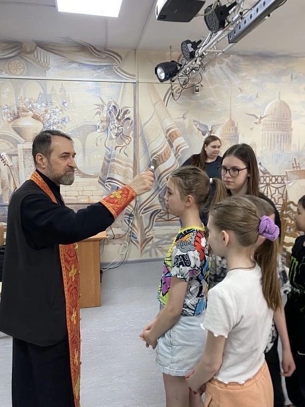 Клирик храма иерей Алексей Закомалдин посетил детский дом «Аистенок». Встреча стала разговором о смысле Воскресения Христова — не только о традициях, но о жизни, добре и выборе человека. После беседы был совершен молебен, детей окропили святой водой и передали им пасхальные куличи.