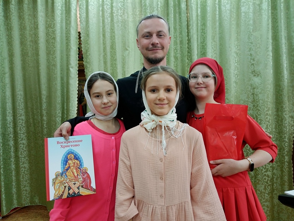 Настоятель храма иерей Кирилл Горбунов поблагодарил педагогов воскресной школы и вручил им подарки. Ребята получили пасхальные угощения, а завершился праздник общим чаепитием.