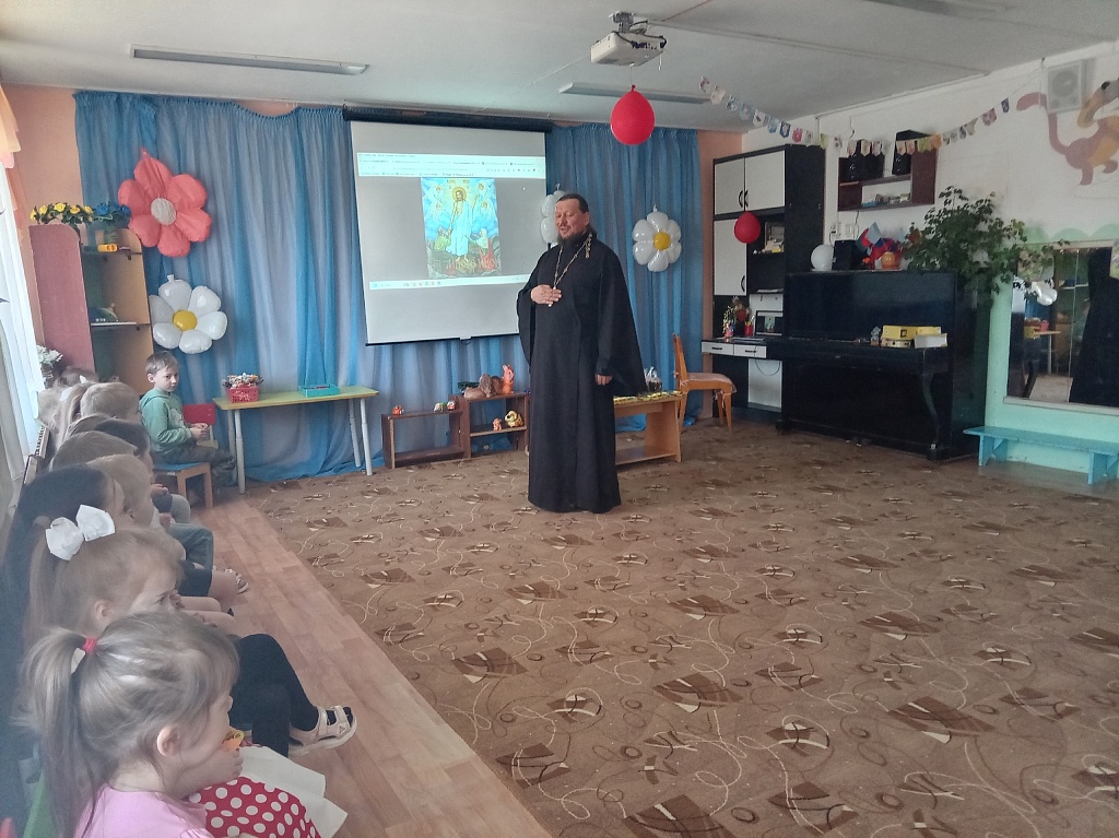 Настоятель Свято-Ильинского храма села Новоандреевка протоиерей Димитрий Кудряков вместе с детьми воскресной школы посетил сельский детский сад. Батюшка и отроковица Анна рассказали детям о Пасхе простыми и понятными словами, исполнили пасхальные песнопения и вручили подарки от храма.