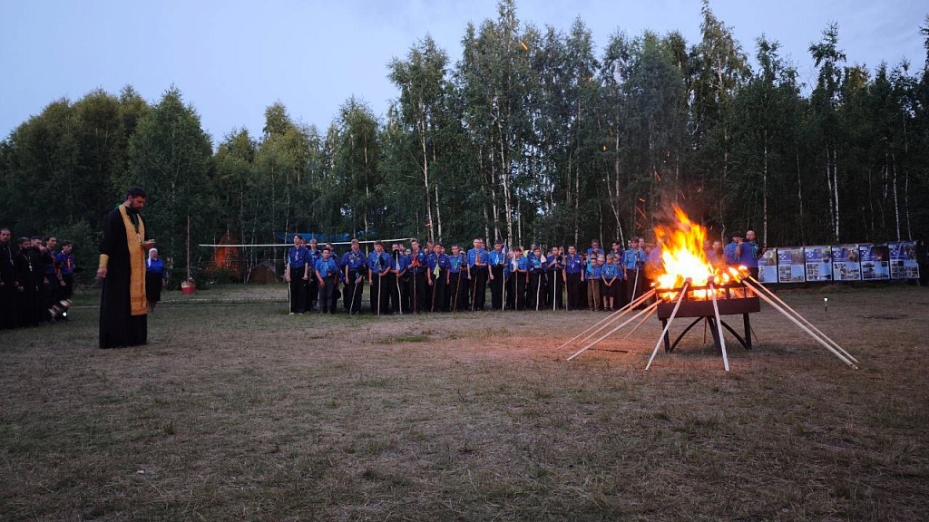 Каждый день начинался и завершался общей молитвой. Семь священников духовно окормляли ребят. В воскресный день торжественным строем, под дробь барабанов, следопыты пришли в храм великомученика Георгия Победоносца в селе Губернском. Более 240 ребят причастились Святых Христовых Таин. Вечером состоялась церемония Памяти Верных – лития по всем усопшим следопытам и воинам, послужившим Отечеству.