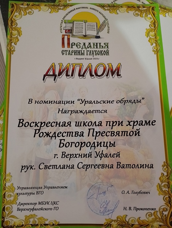 Вчера воспитанники воскресной школы, их родители и прихожане храма Рождества Пресвятой Богородицы Верхнего Уфалея приняли участие в фестивале-конкурсе народных традиций «Предания старины глубокой». В номинации «Уральские обряды» представители храма удостоились Гран-при конкурса.