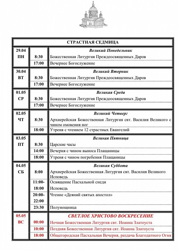 11:00-18:00 – освящение Пасхальной снеди. Исповедь