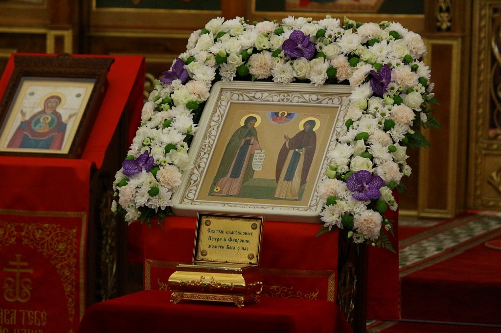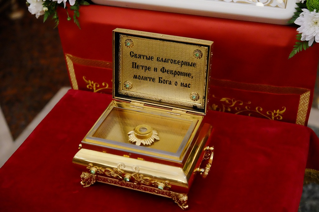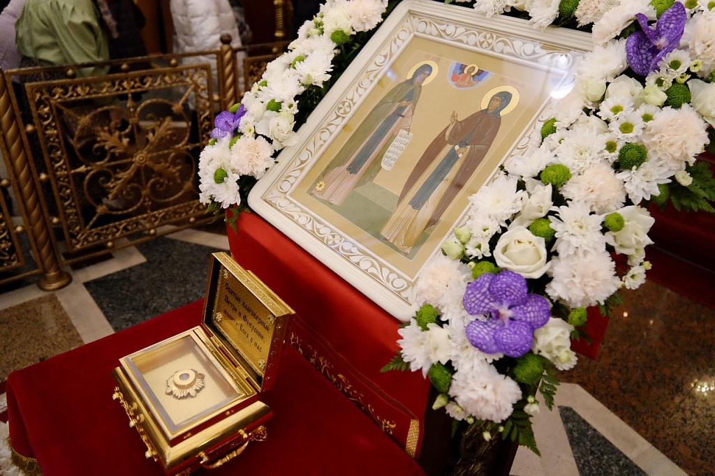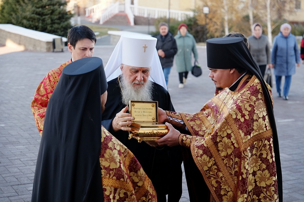 Владыка Климент доставил в собор Магнитогорска ковчег с частицей мощей благоверных князей Петра и Февронии, который был торжественно установлен на центральный аналой. В Год семьи молитвы этим небесным покровителям семей особенно своевременны.
