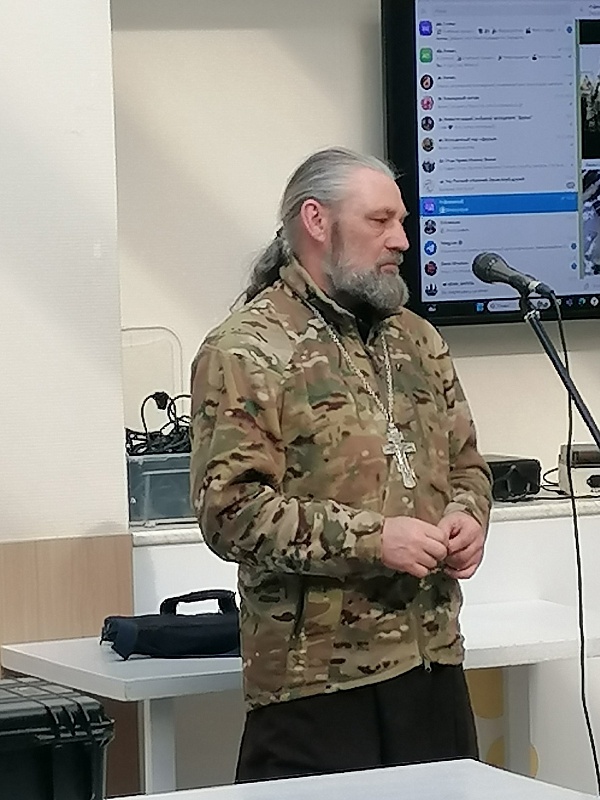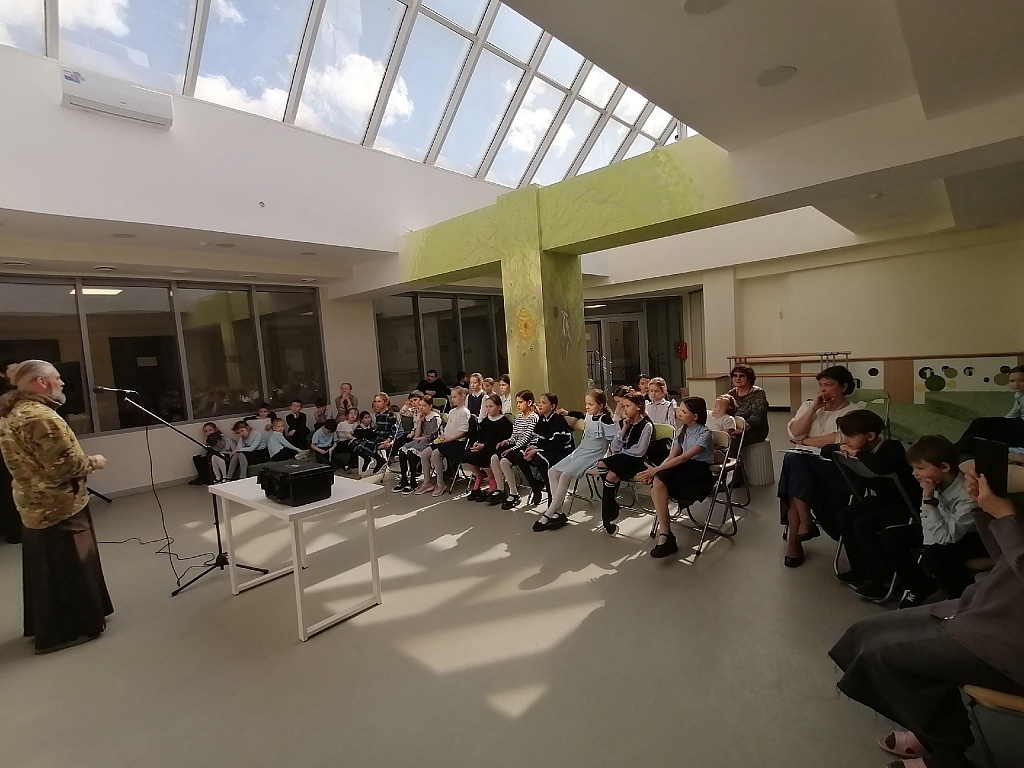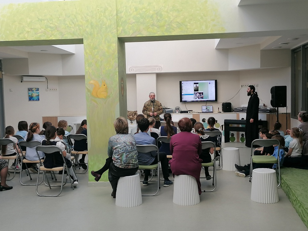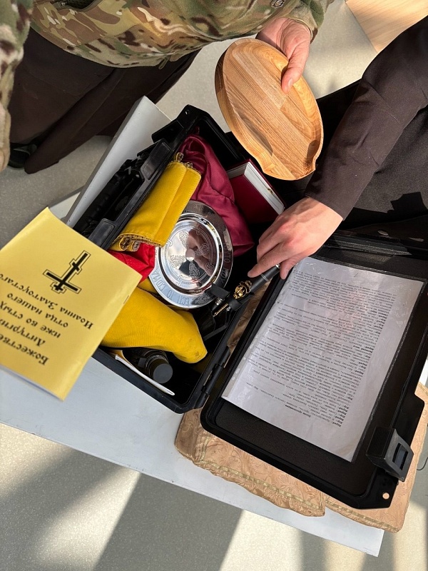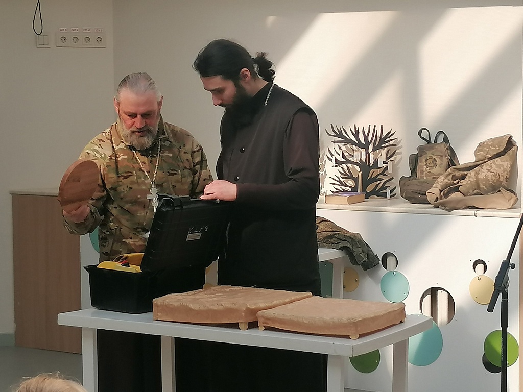 Он показал детям фотографии полевого храма. Объяснил, что их сооружают прямо в блиндажах, закрывают маскировочными сетями и ветками, чтобы с воздуха не было видно. Школьники увидели и чемоданчик военного священника, который позволяет перевозить все необходимое для службы.