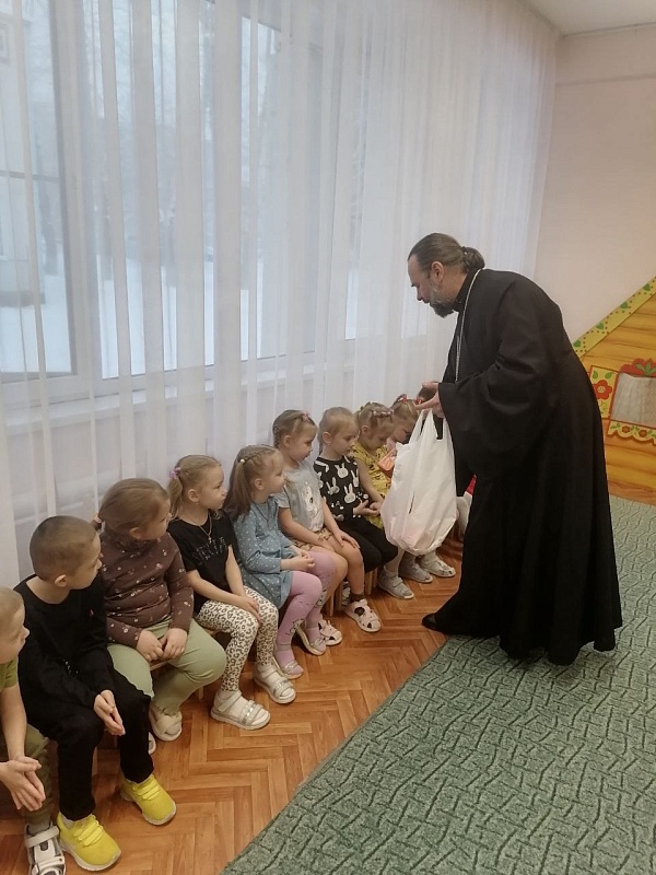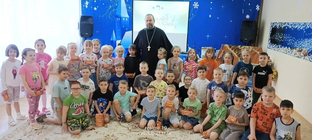 Отец Георгий поздравил детей с Рождеством, объяснив, что это день рождения Спасителя, пришедшего в мир с любовью. Затем он рассказал о празднике Крещения, или Богоявления.
