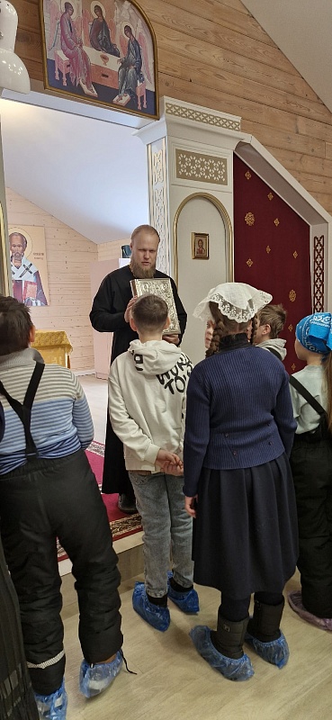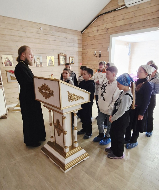 Священник рассказал детям о Боге, вере, святых и устройстве храма. Школьники активно задавали вопросы и участвовали в беседе.