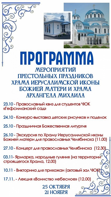 Также в программе торжеств: конкурс-выставка детских рисунков и поделок (24 октября), экскурсия по храму Иерусалимской иконы Божией Матери (26 октября в 11:00), ярмарка и народные гуляния (3 ноября в 12:00), викторина для прихожан (10 ноября), лекция на тему «Воинство Небесное» (17 ноября).