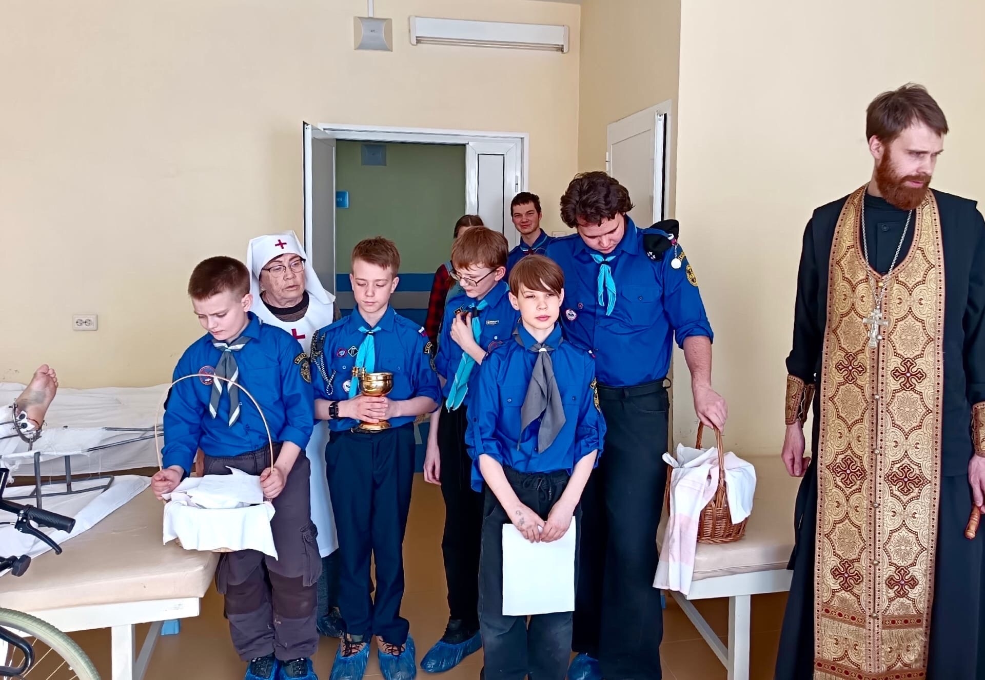 Следопыты храма Луки Крымского вместе с сестрами милосердия и иереем Александром Федоровым побывали в ГКБ №6. В отделениях травматологии и кардиологии они раздавали пациентам и врачам традиционных «жаворонков» и листовки с рассказом о святых воинах. Отец Александр окропил пациентов святой водой, а ребята делились историей подвига мучеников.