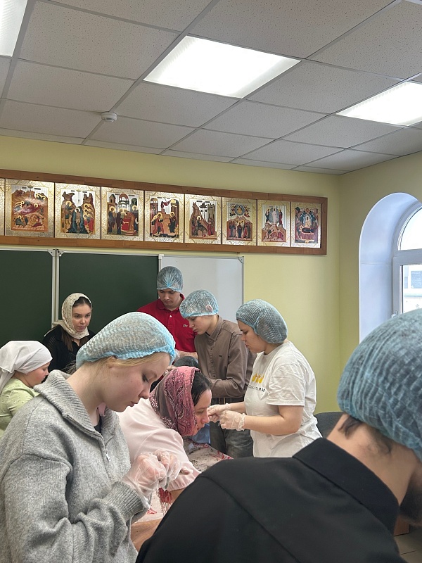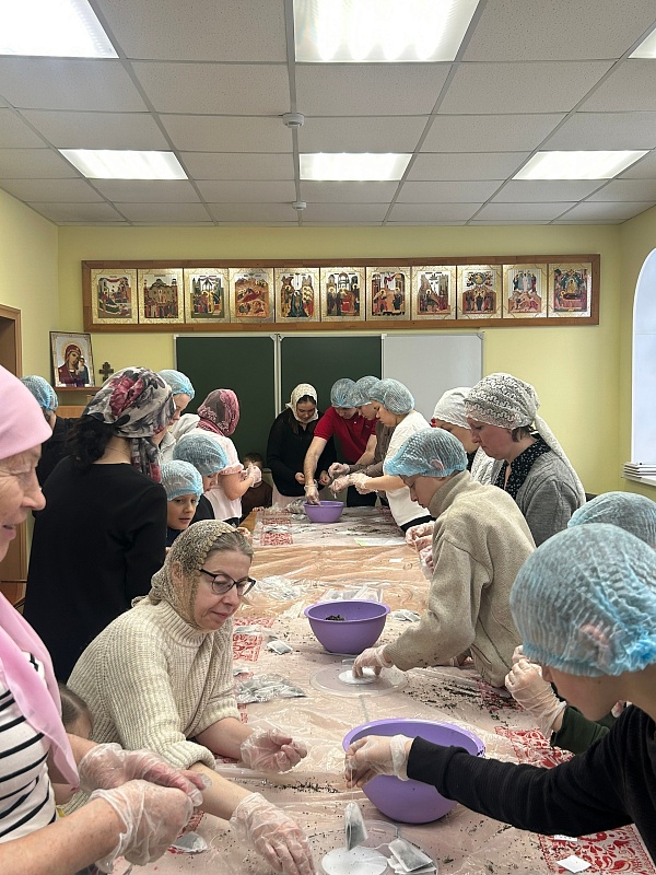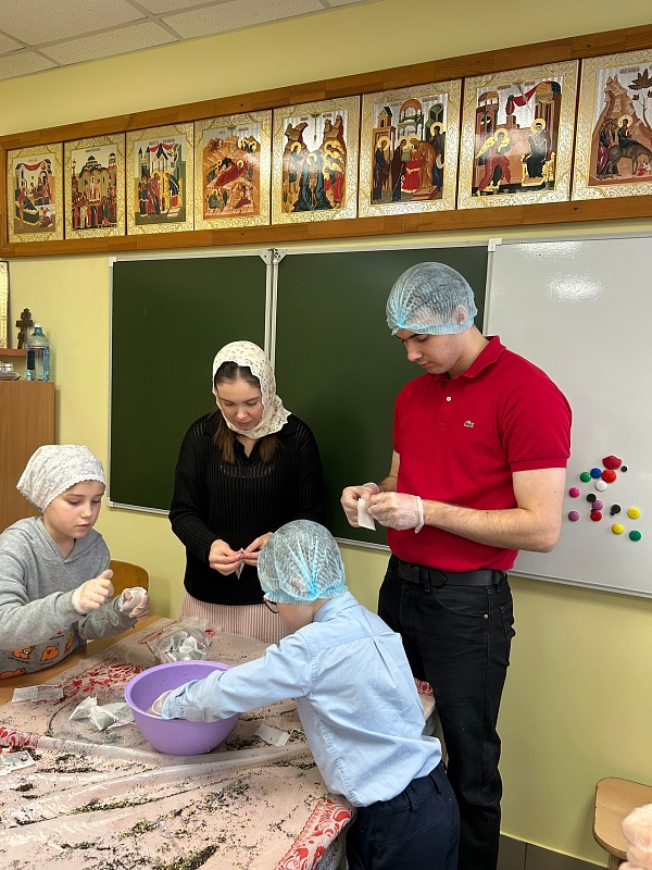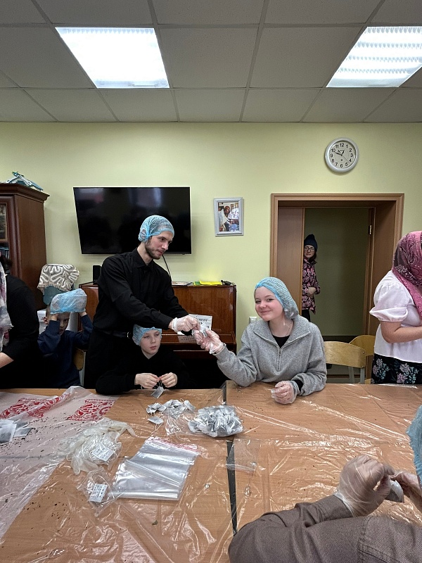 Затем молодежь вместе с педагогами помогала воскресной школе фасовать лечебный травяной чай для воинов ко Дню защитника Отечества. Встреча завершилась чаепитием и живым общением.