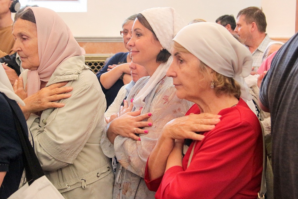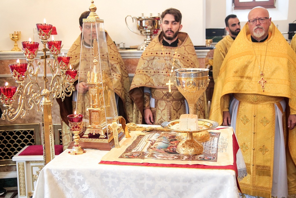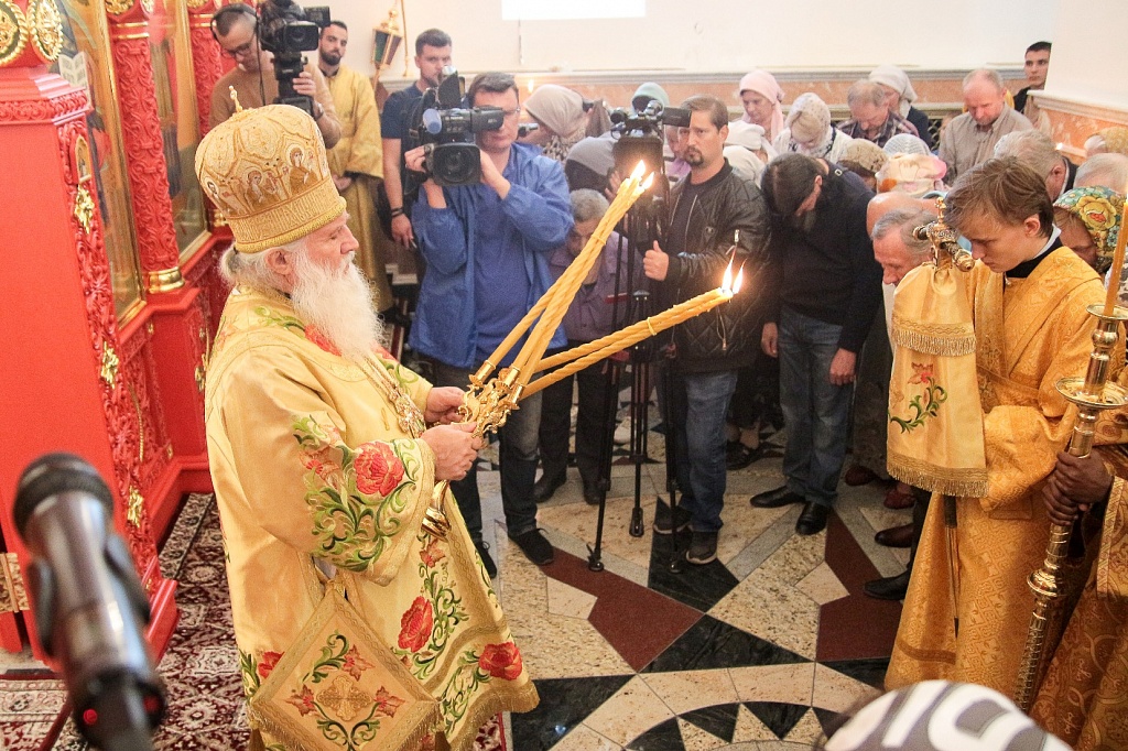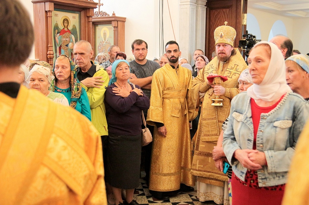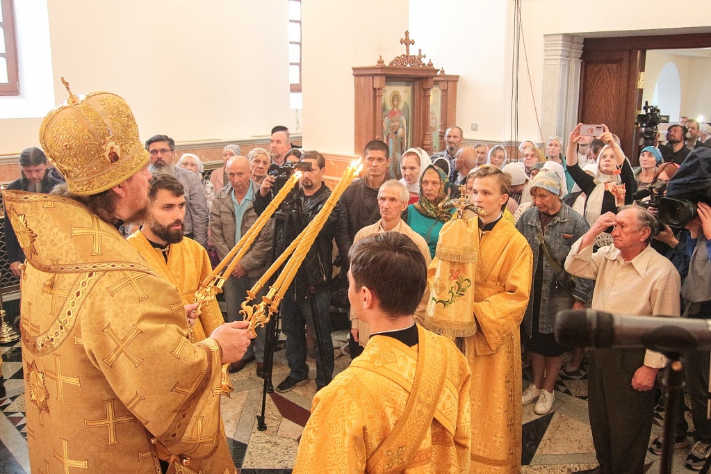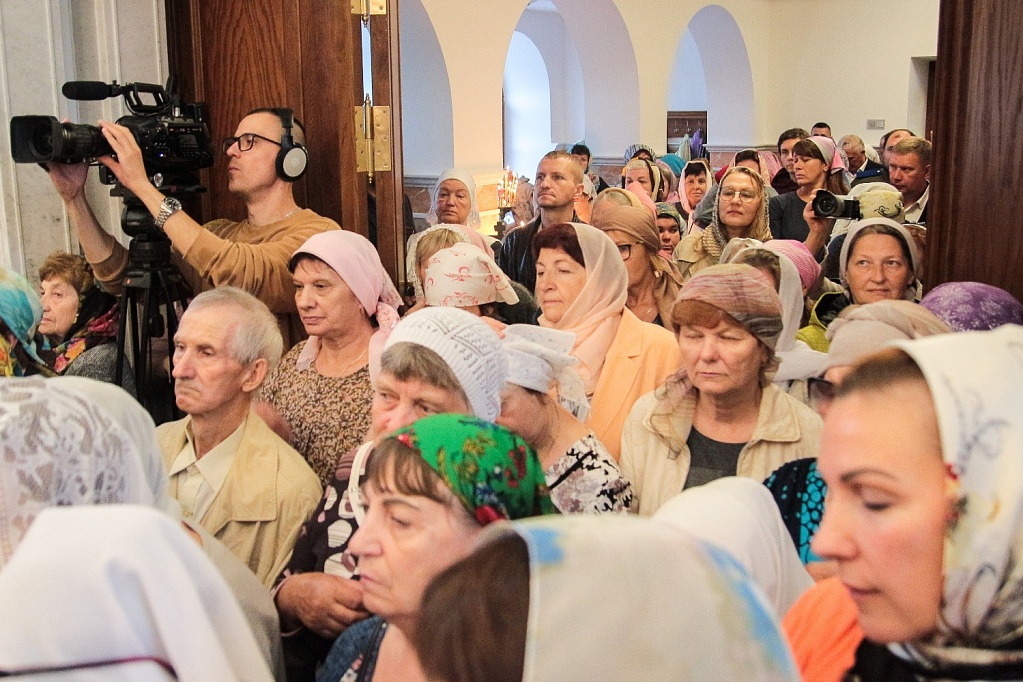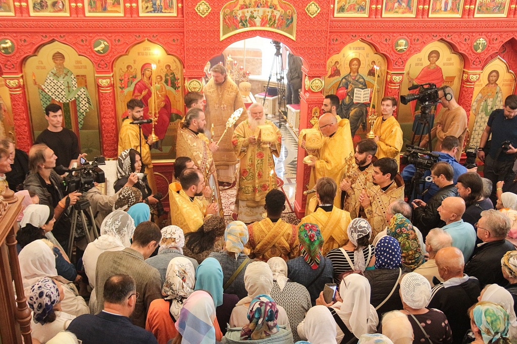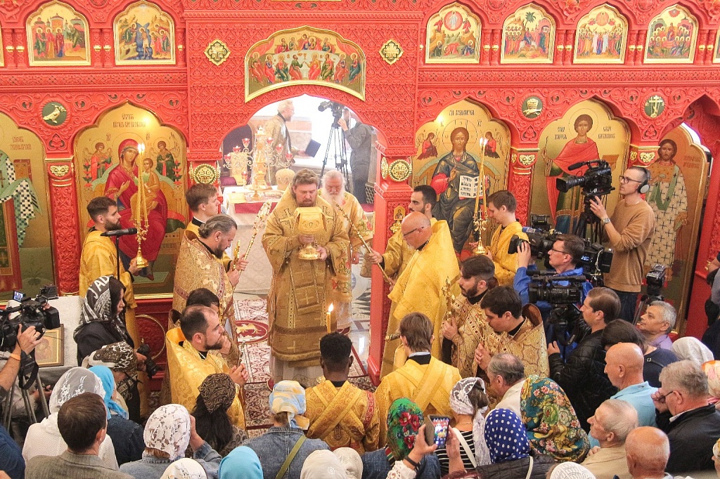 Сразу после освящения в храме прошла первая Божественная литургия. На торжество пришло великое множество людей, церковное здание было забито до отказа. Прямую трансляцию богослужения вел православный телеканал «Союз».