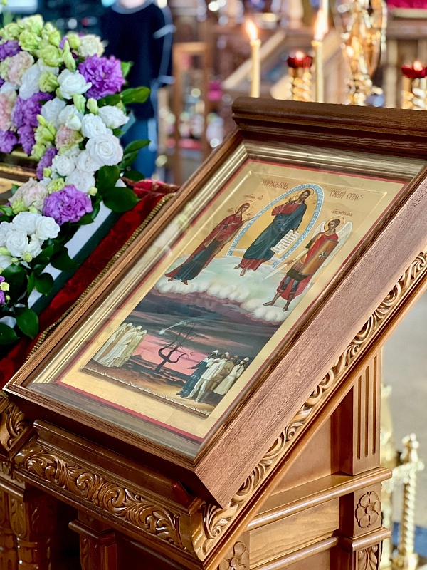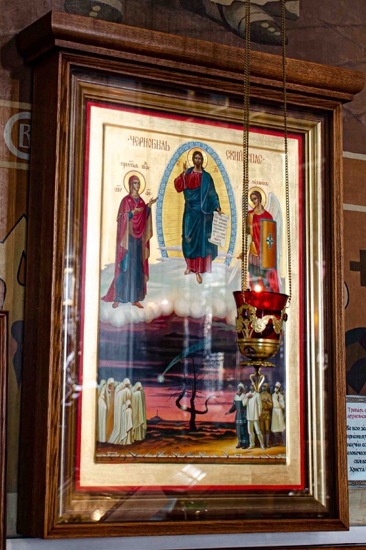 В храме хранится особая святыня — икона «Чернобыльский Спас». Это редкий образ, посвященный памяти чернобыльской аварии. На иконе изображены Спаситель, Божия Матерь, Архангел Михаил, ликвидаторы аварии и души погибших. Над разрушенным четвертым энергоблоком расположена звезда Полынь, напоминающая о словах Апокалипсиса, а в нижней части — чернобыльская сосна в форме распятия как символ страдания.