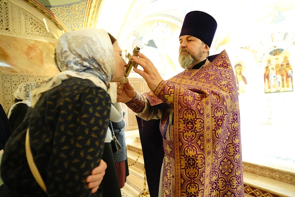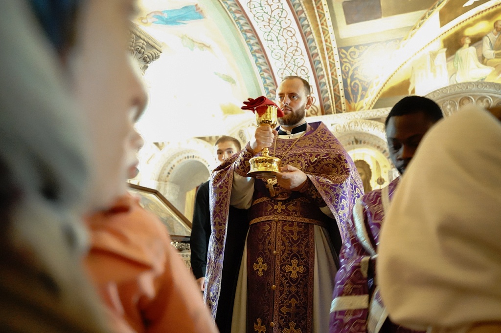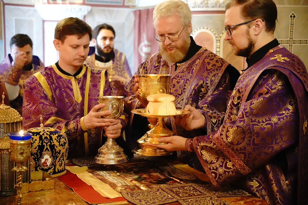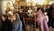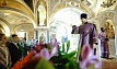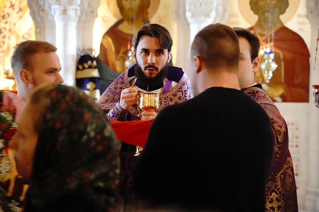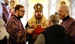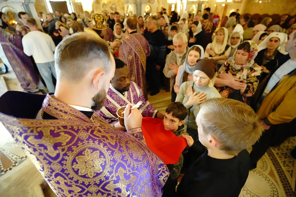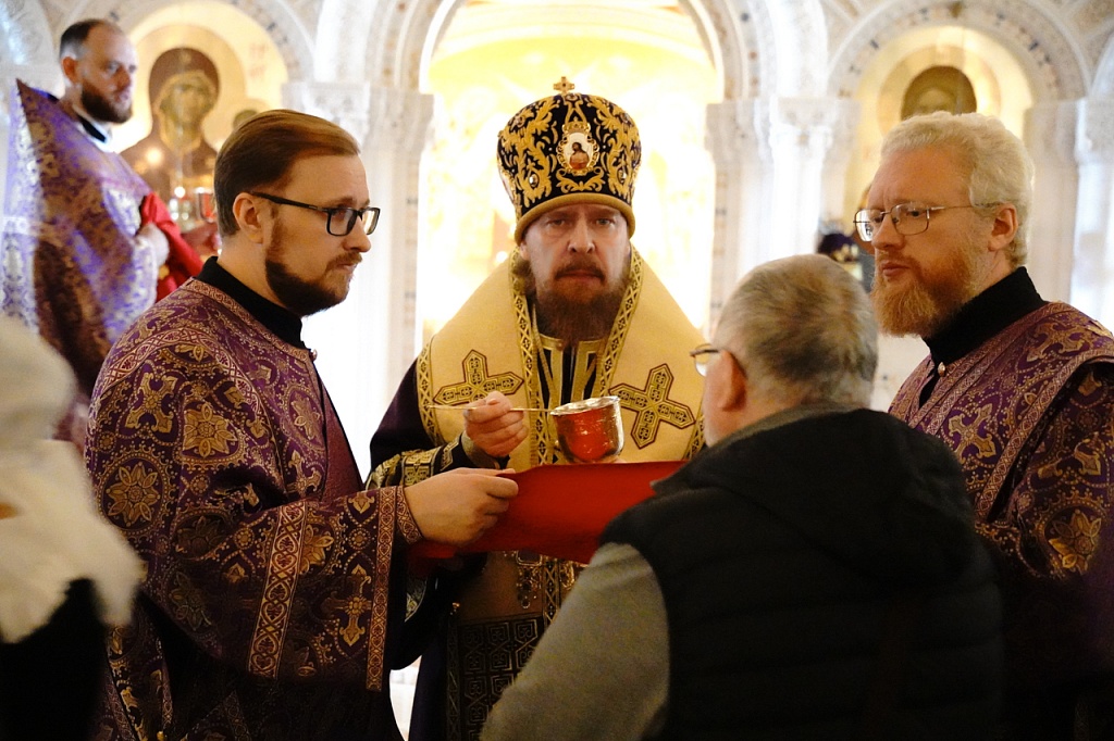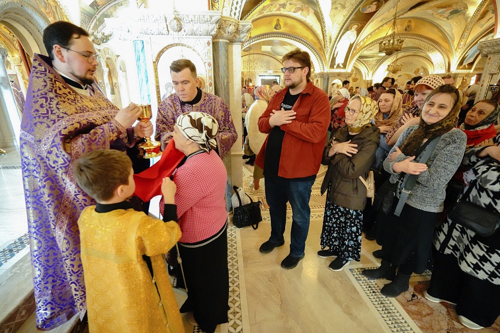 В этот день православные христиане стремятся причаститься Святых Христовых Таин. В проповеди митрополит Алексий поздравил прихожан с принятием Святых и Животворящих Христовых Таин.