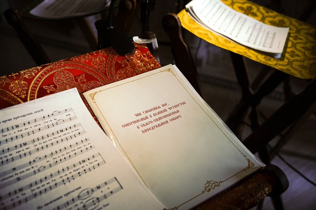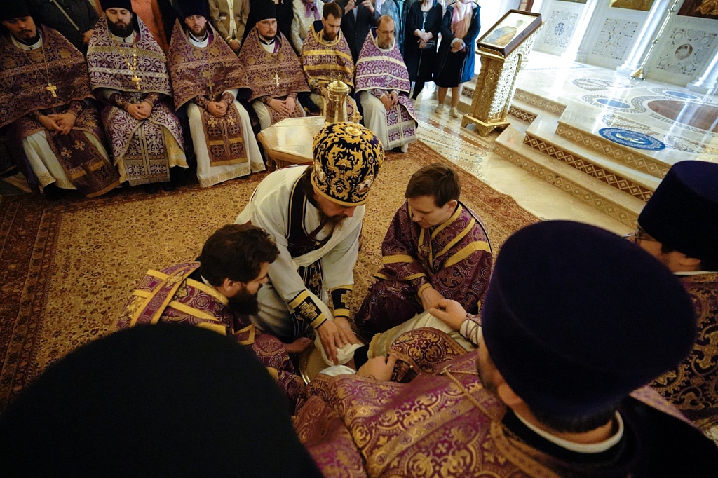 Богослужение повторяет детали евангельской истории. Последний из священников, подражая благоговейному порыву апостола Петра, возражает: «Господи, Ты ли мои умыеши нозе?» На что слышит ответ: «Аще не умыю тебе, не имаши части со Мною».
