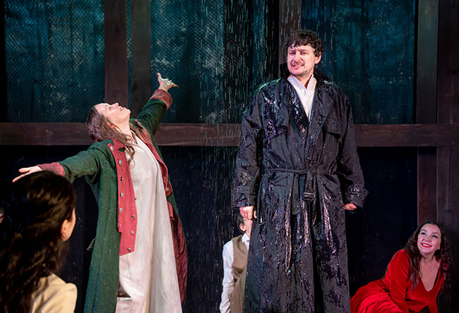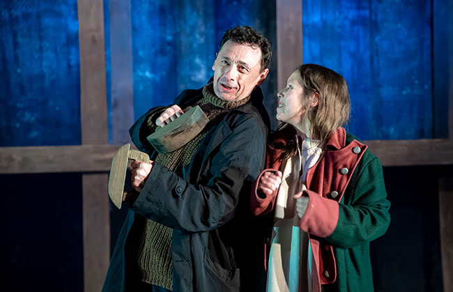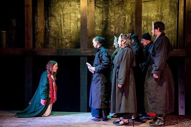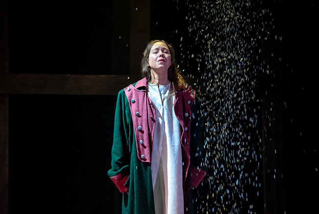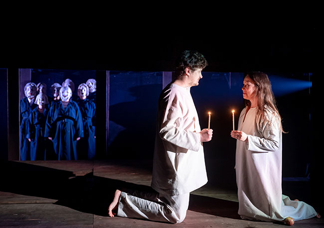 На сцене почти нет декораций — только деревянный помост и двухуровневое пространство, где действие плавно переходит от земного к духовному.