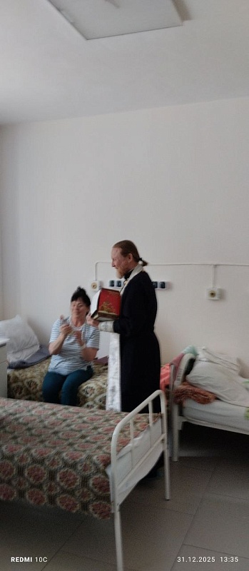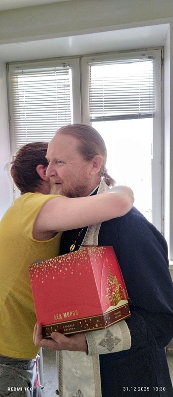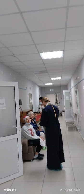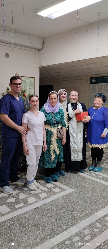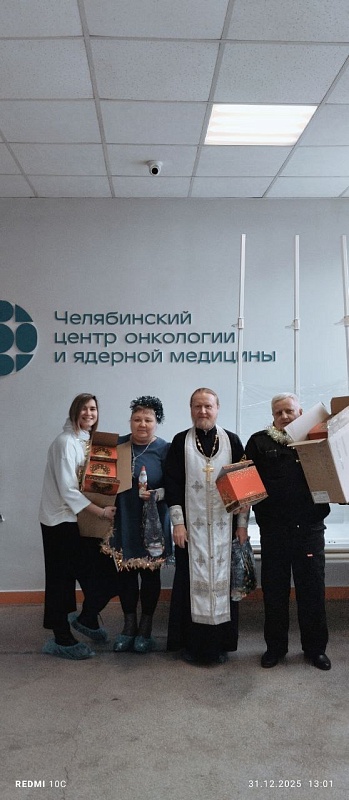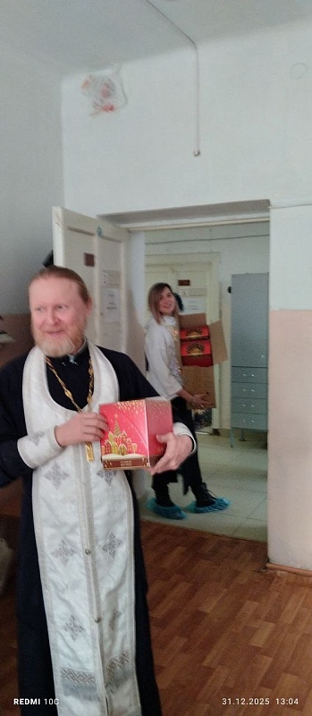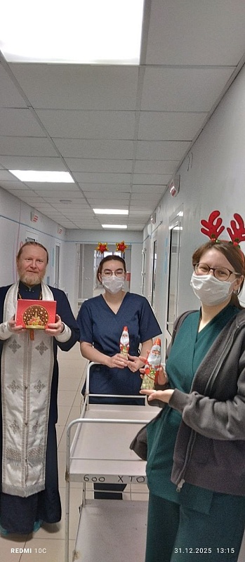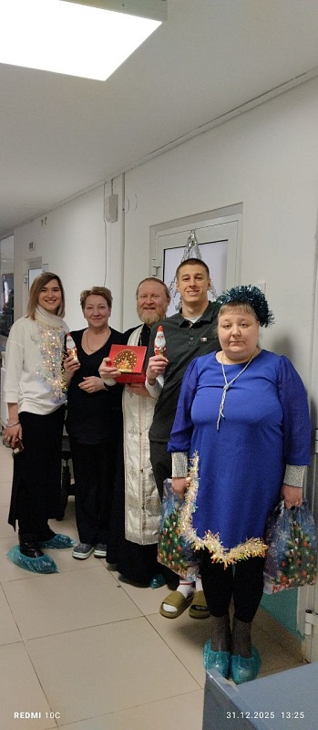 В канун Нового года настоятель храма иерей Димитрий Волков и прихожане пришли в онкоцентр поздравить пациентов и медицинский персонал. В подарок вручали шоколадку в виде Деда Мороза, пели новогодние песни, всем желали здоровья и благополучия.