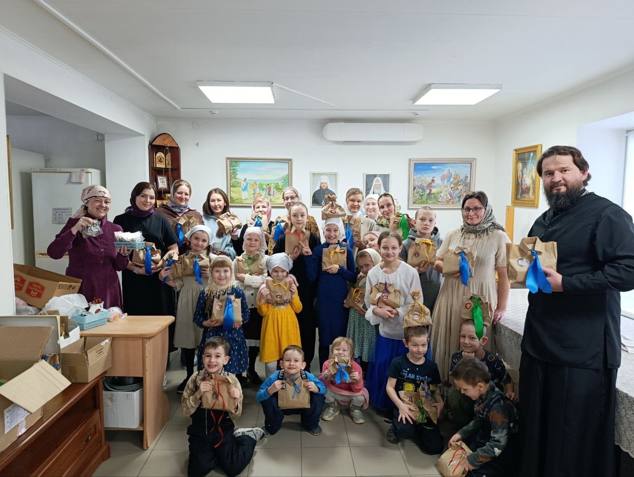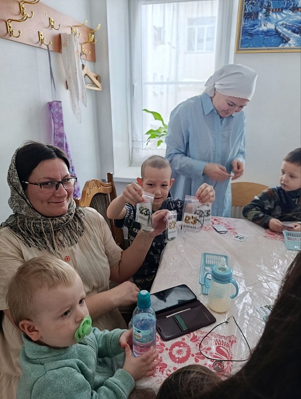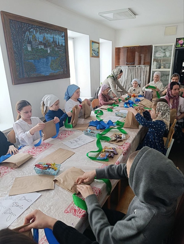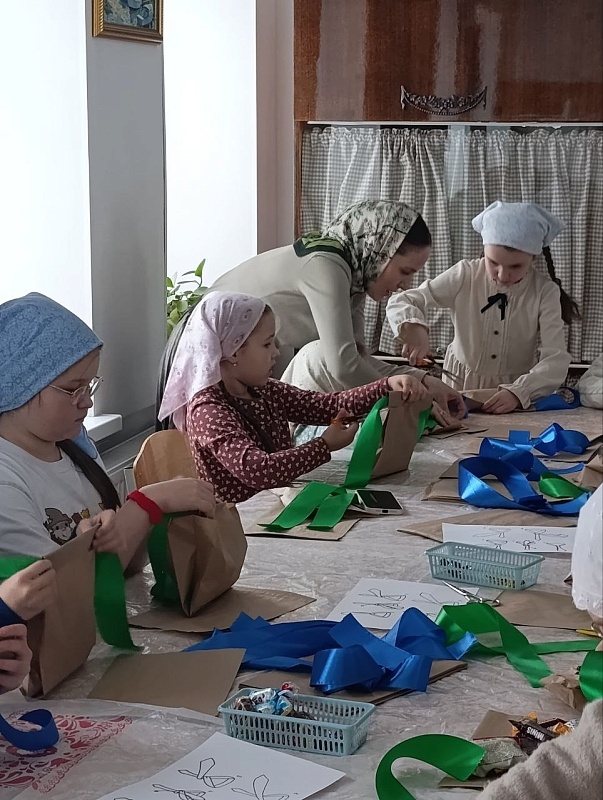 В начале встречи для детей провели музыкальную игру-знакомство. А затем на мастер-классах ребята, родители и участники Объединения православной молодежи храма сделали 80 медальонов и упаковали более 100 сладких подарков в виде «рубашек» для воинов ко Дню защитника Отечества.