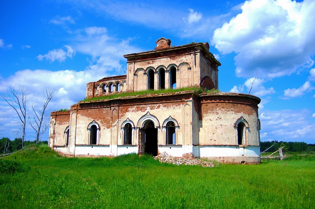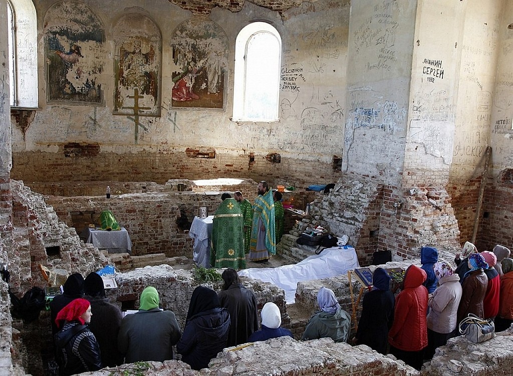 Действительно, место это особенное. Среди смешанного леса на огромной поляне стоит разрушенный, но все еще величественный храм. По накатанной лесной дороге, особенно после хорошего дождя, добраться в урочище можно только на тракторе.