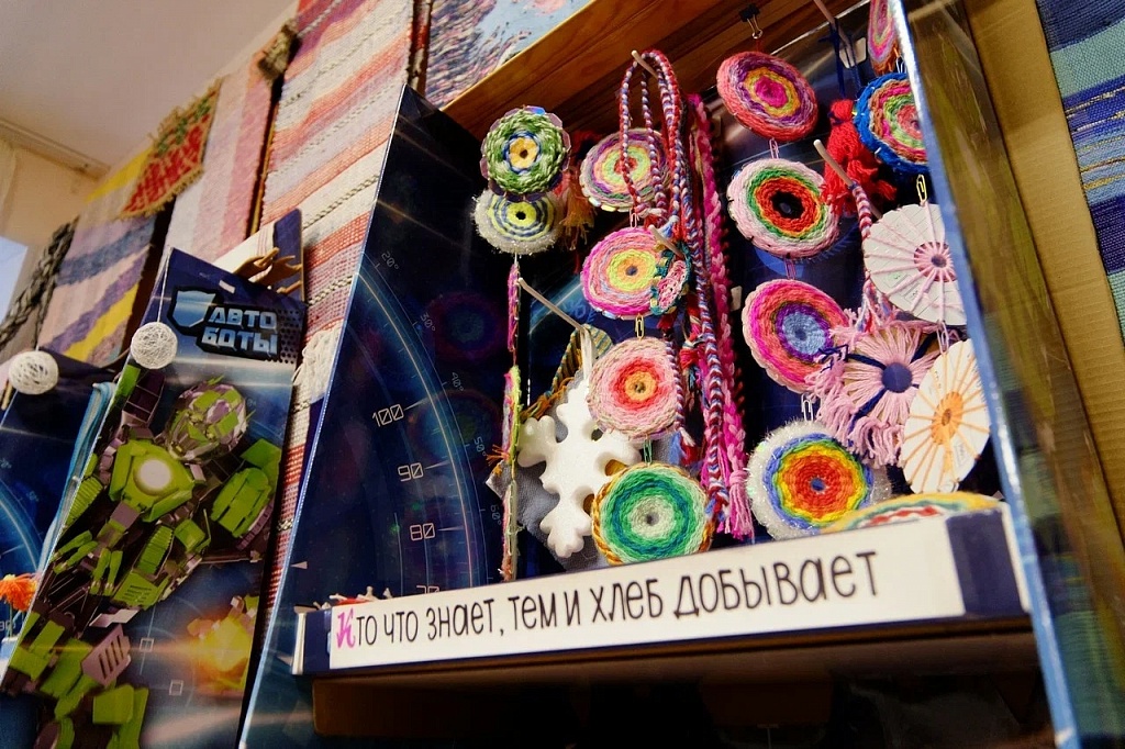 Сейчас в мастерской четыре больших ткацких станка и еще несколько маленьких. Ткут красоту не только из нитей, но и из нарезанных на полоски ненужных вещей. Больше десяти лет существует этот проект, сменилось несколько преподавателей, но неизменен интерес к ткацкому ремеслу детей и их родителей.